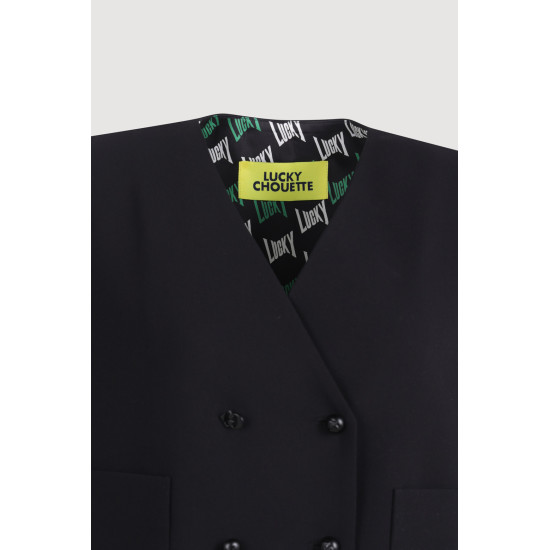 LUCKY 로고 패턴의 안감을 사용하여 포인트를 줌