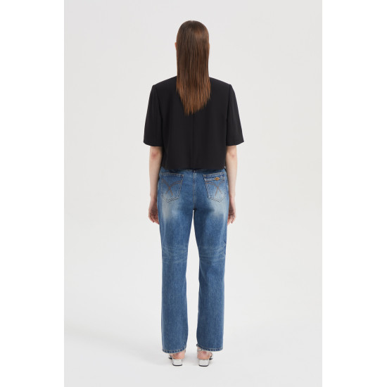 엠블럼 단추로 포인트를 줌. 어깨 패드로 핏과 실루엣을 살림.