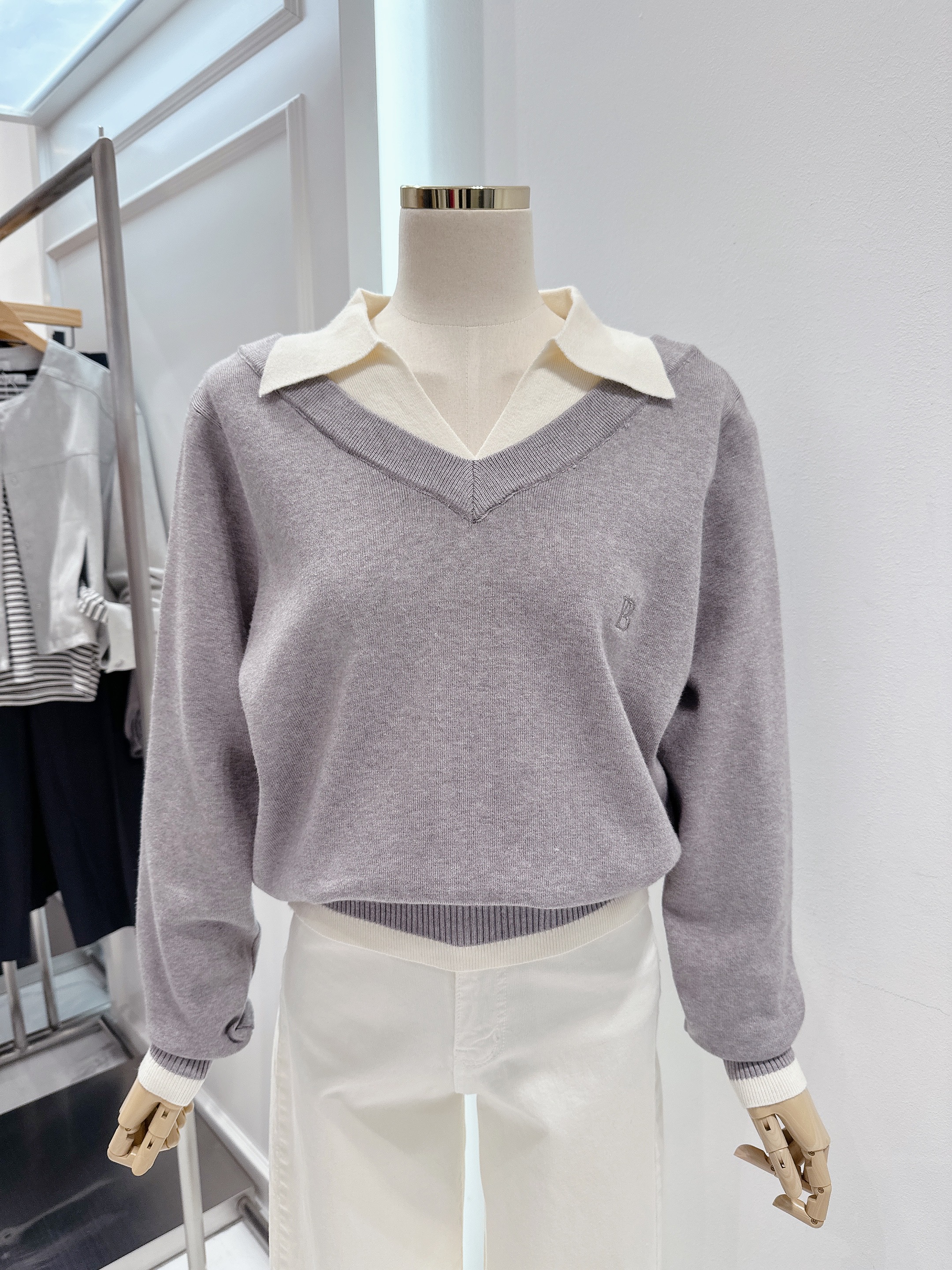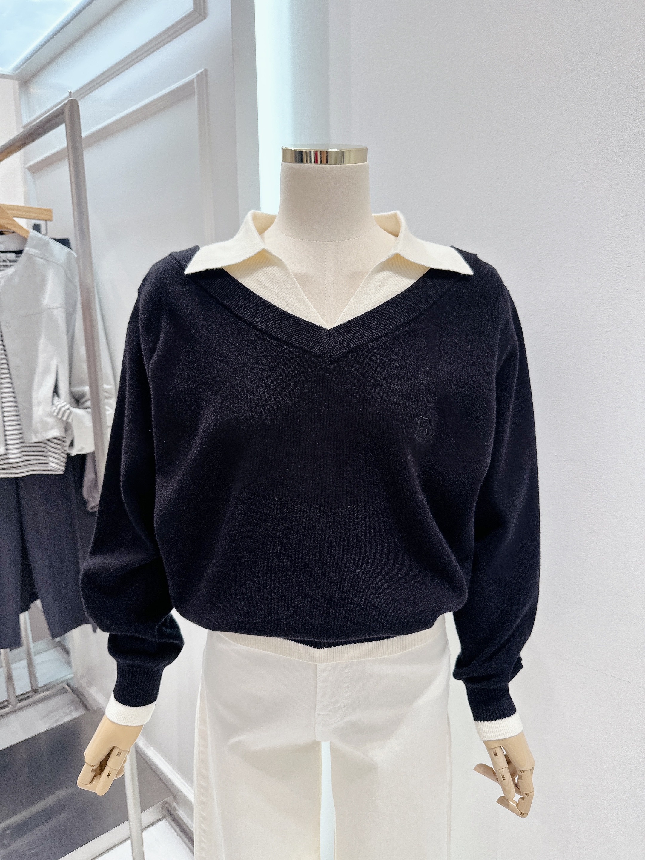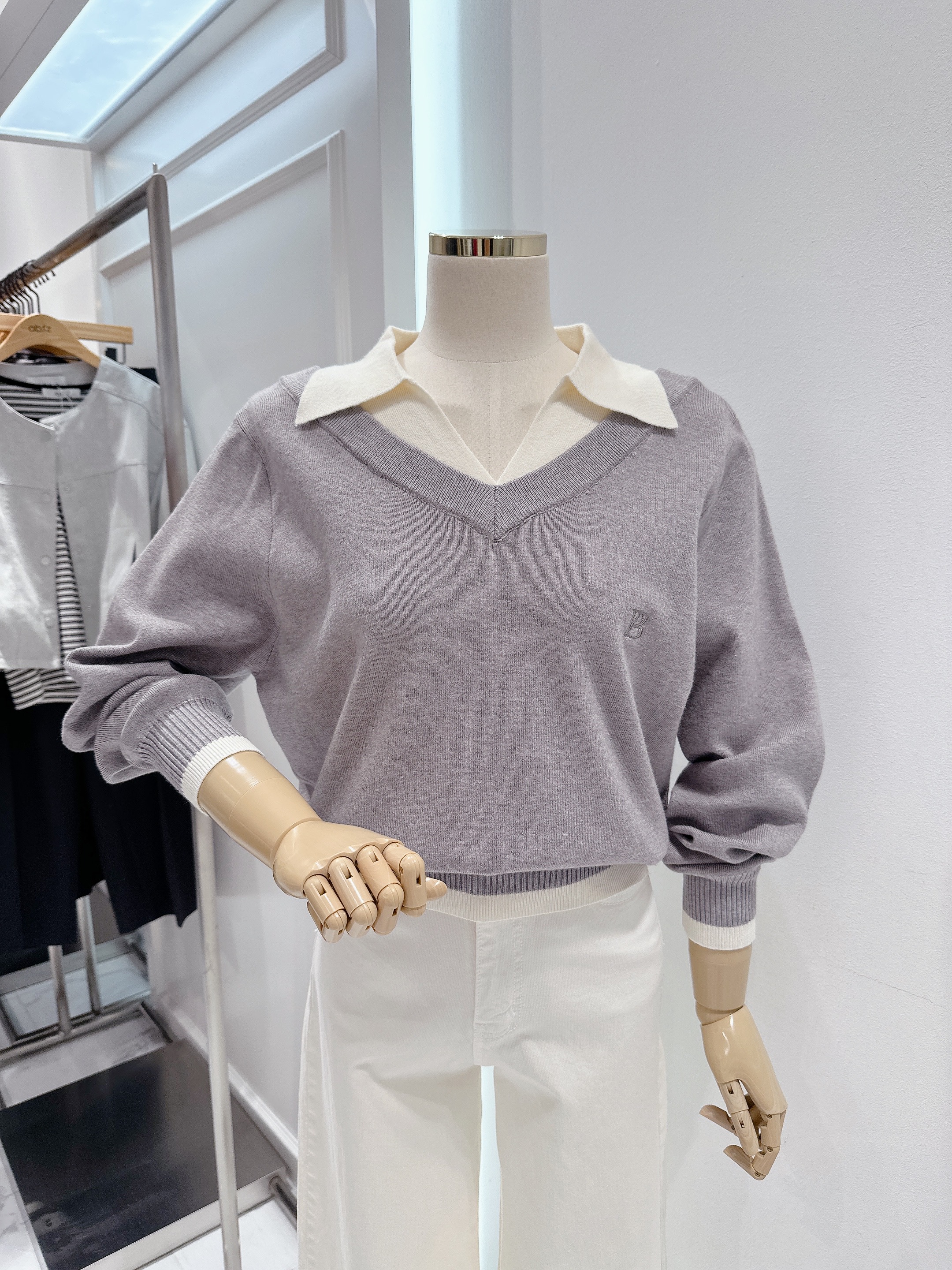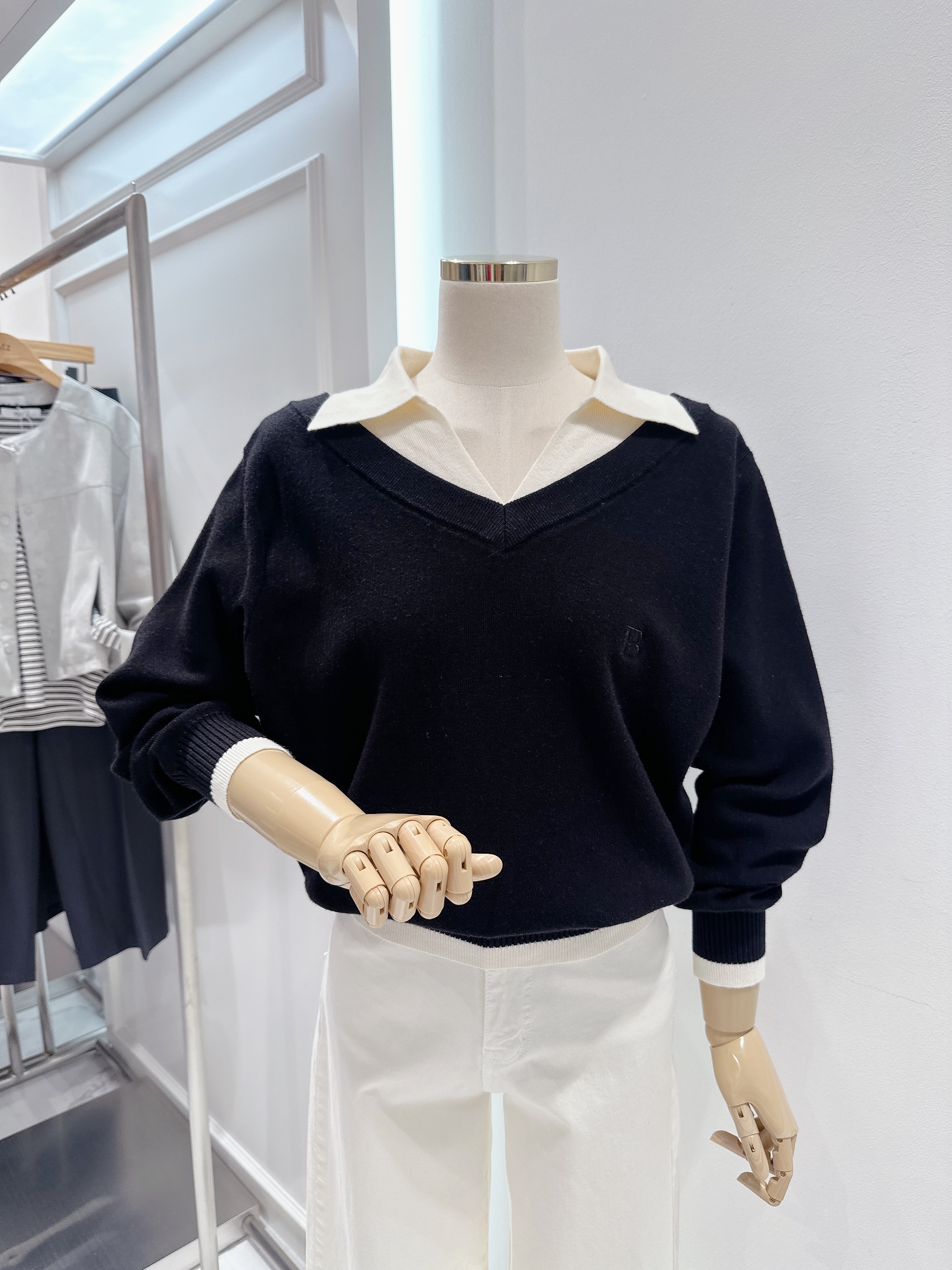 유니크한 이중 배색 카라로 세련된 느낌을 주며