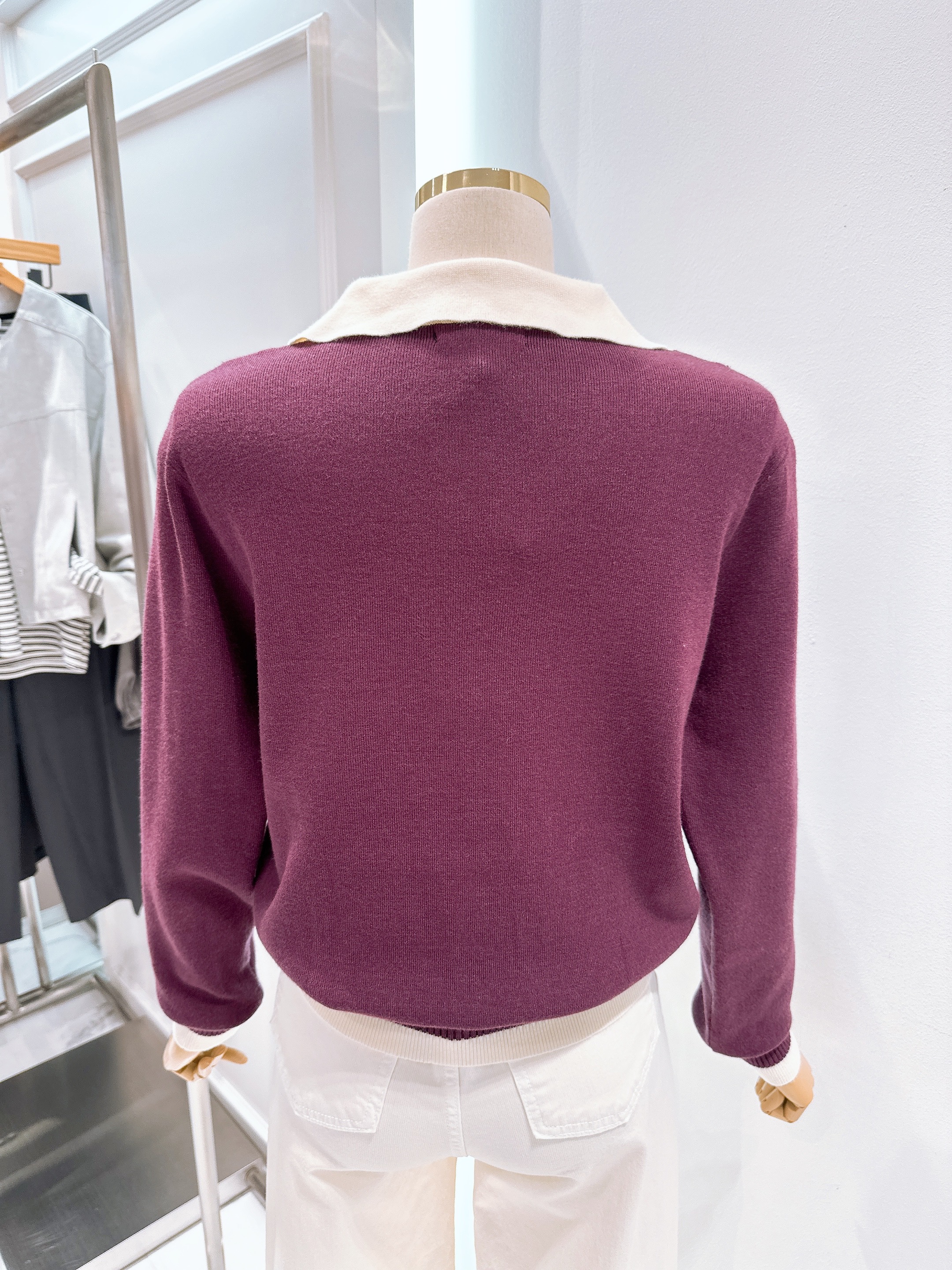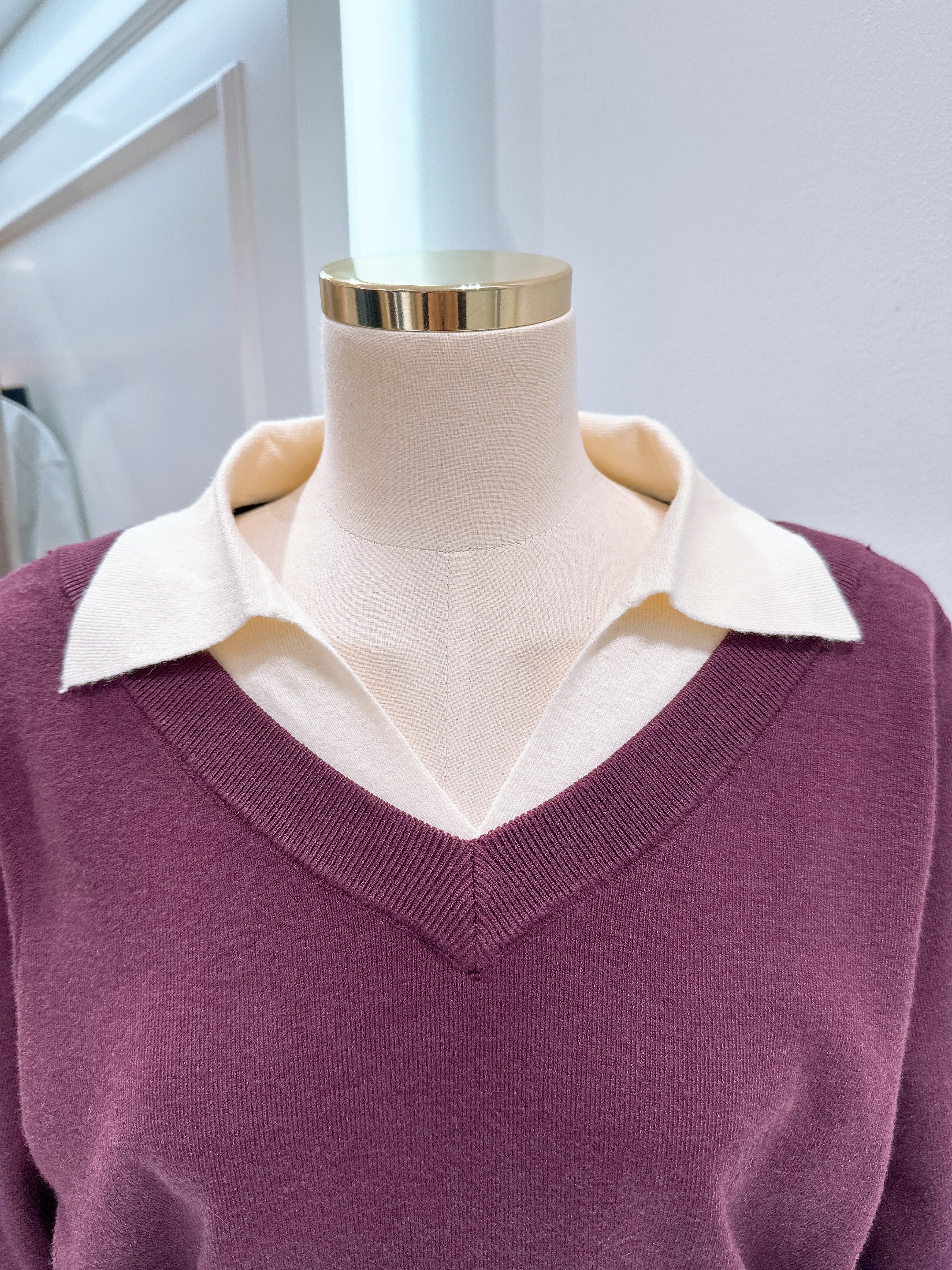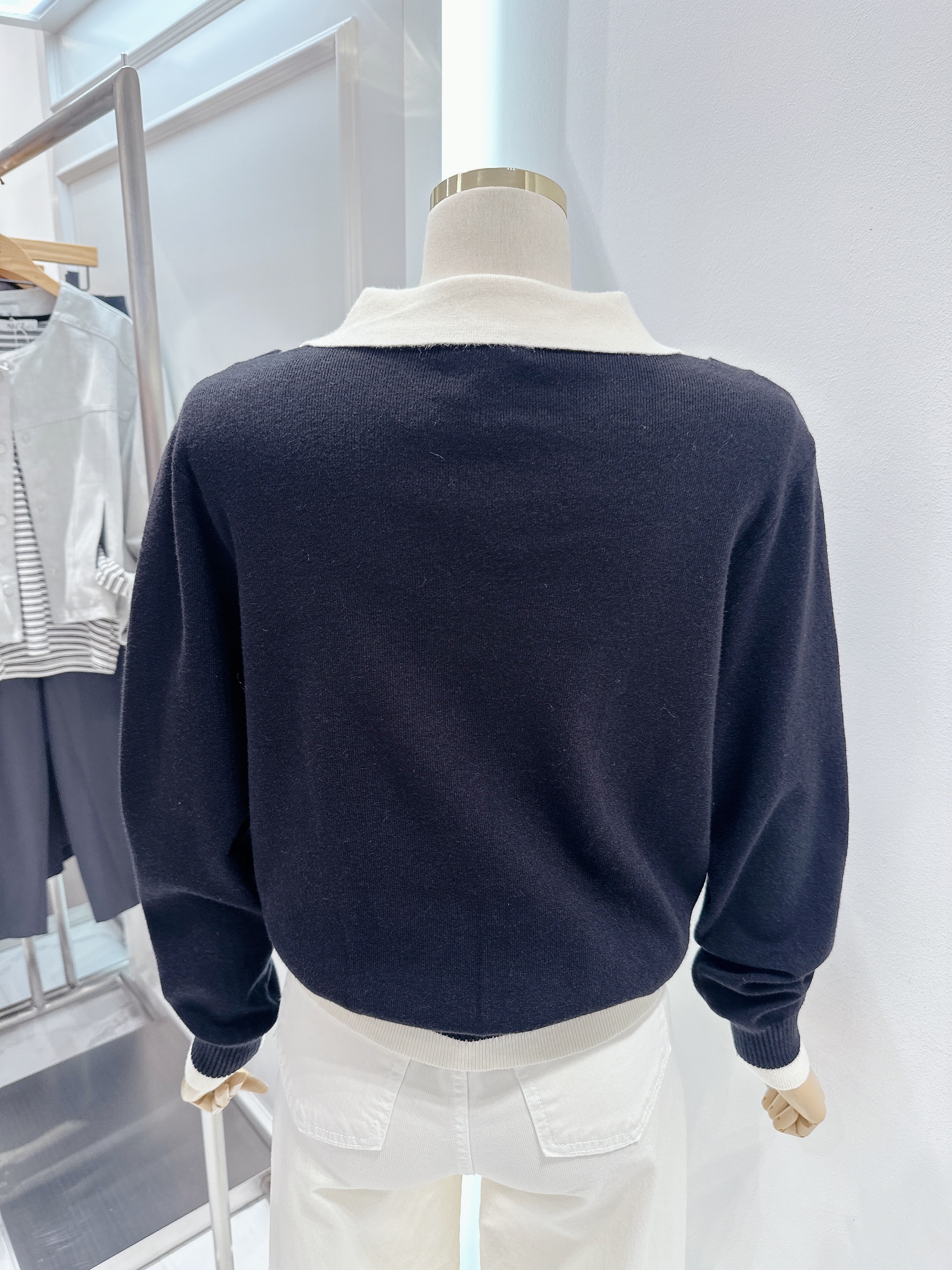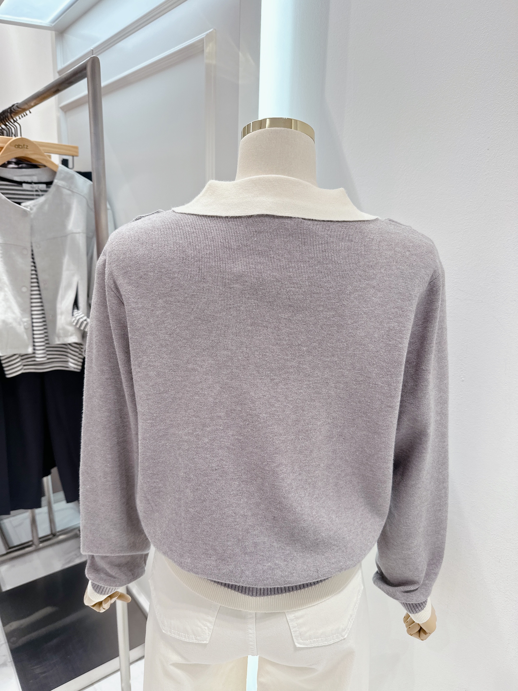 유니크한 이중 배색 카라로 세련된 느낌을 주며