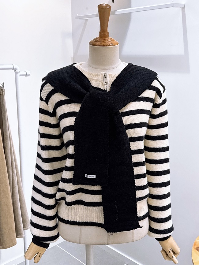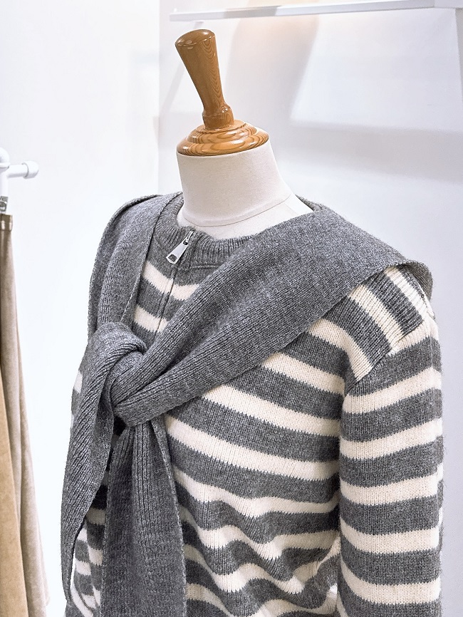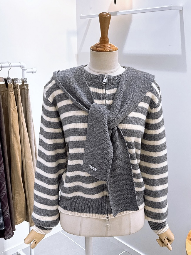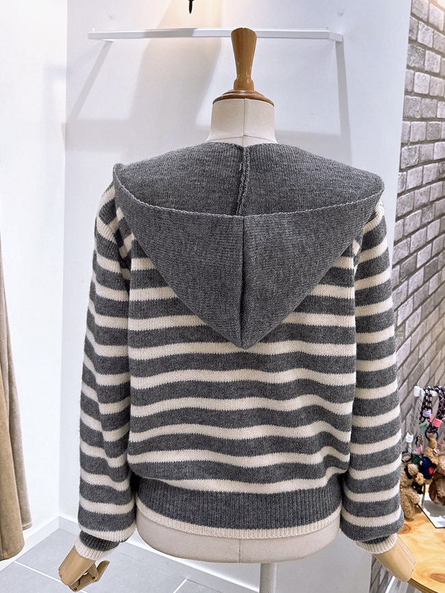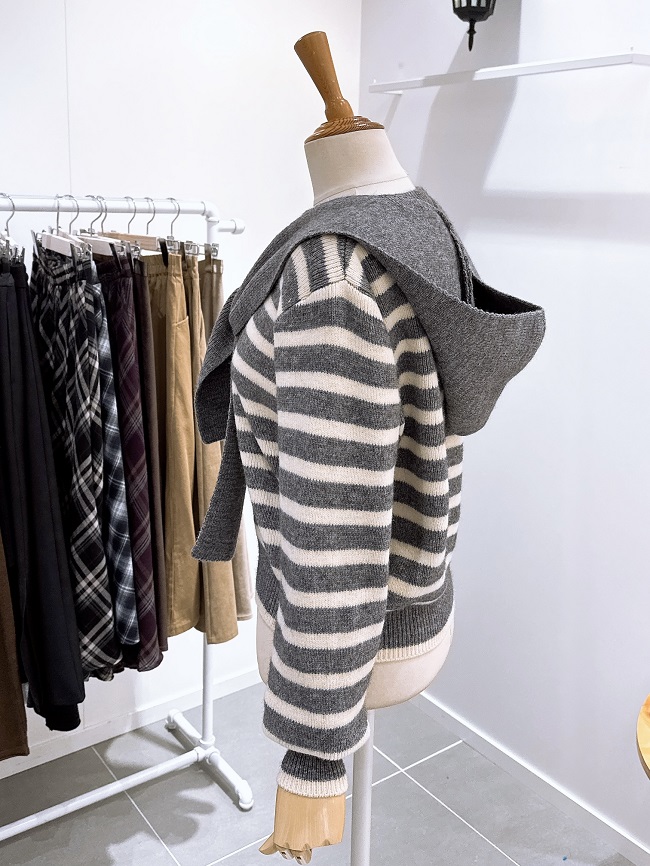 - 귀여운 후드머플러가 세트로 구성된 스트라이프패턴의 가디건입니다
