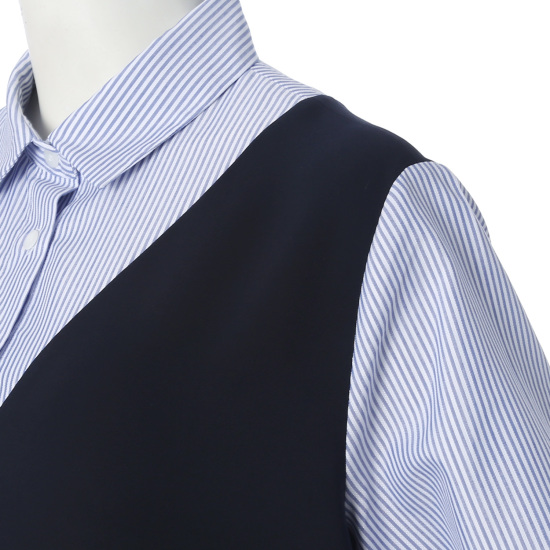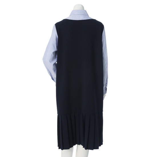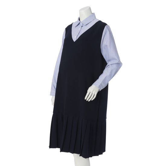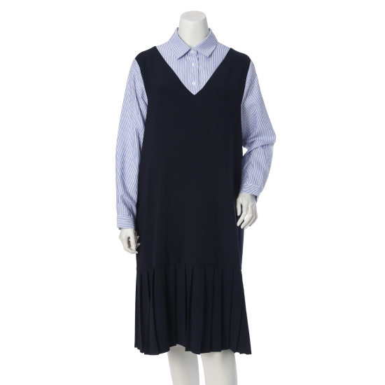 스트라이프 셔츠와 점퍼 스커트가 레이어드된 오버롤 원피스