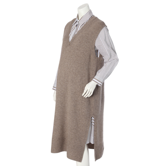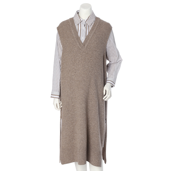 베이지톤으로 세련된 이미지를 연출 하며 A라인으로 떨어지는 핏감이 체형 커버에 탁월합니다