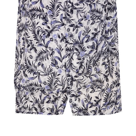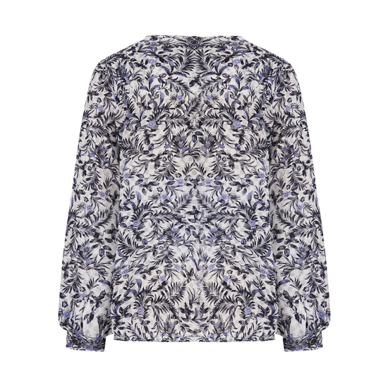 프린트 자가드 풀오버 블라우스입니다. 블루종디테일로 허리를 한 번 잡아주었습니다. 오픈넥 카라와 하프 플라켓의 셔링 디테일로 포인트를 주었습니다.
