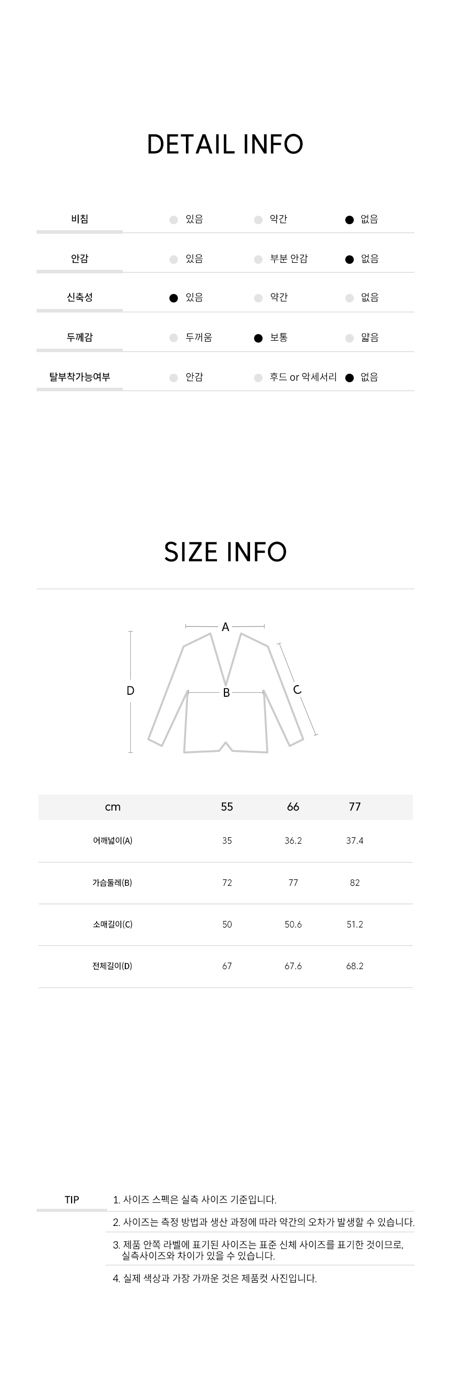 | 치수 | 55, 66, 77 - 사이즈는 측정방법에 따라 1~3cm 정도 오차가 있을 수 있습니다. |