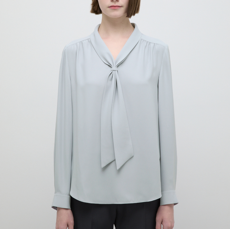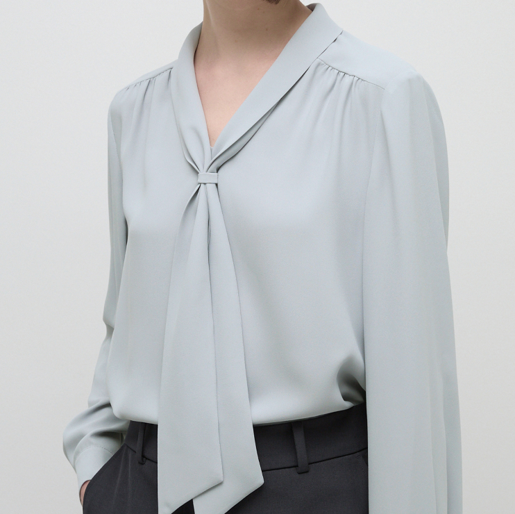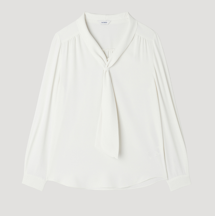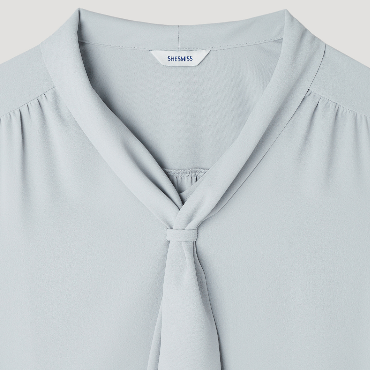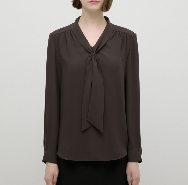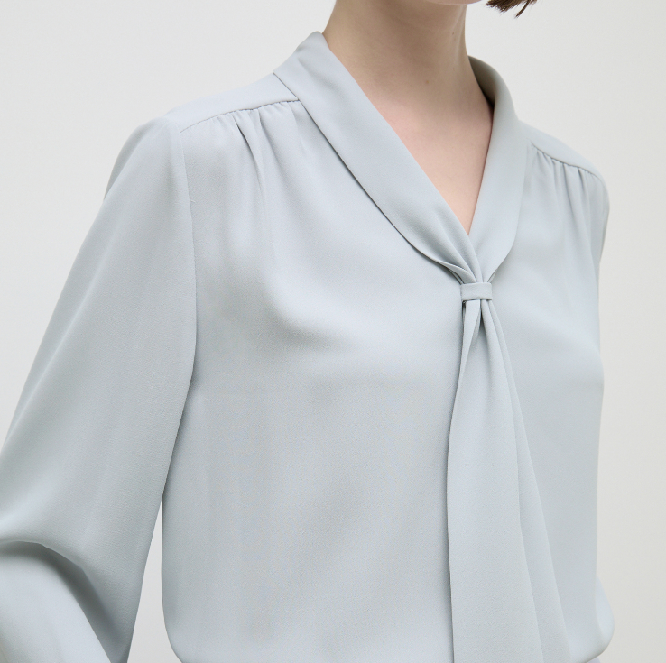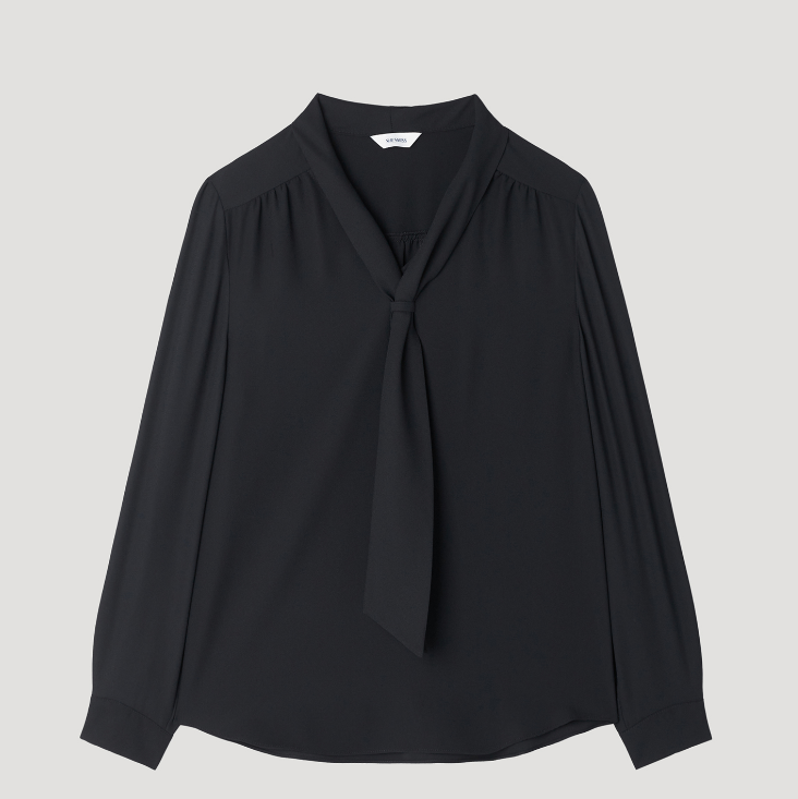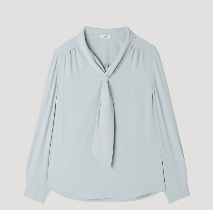 어깨라인의 셔링 디테일과 타이 넥 디자인으로 포인트를 준 블라우스입니다.