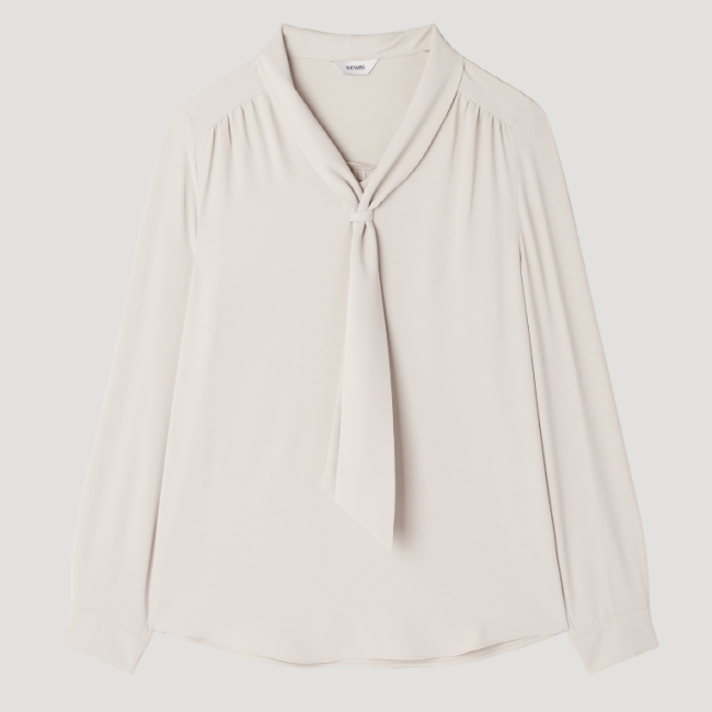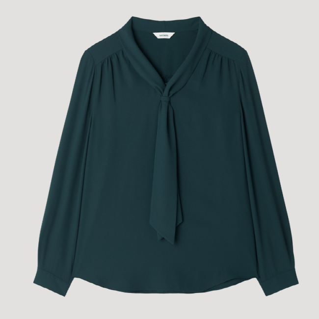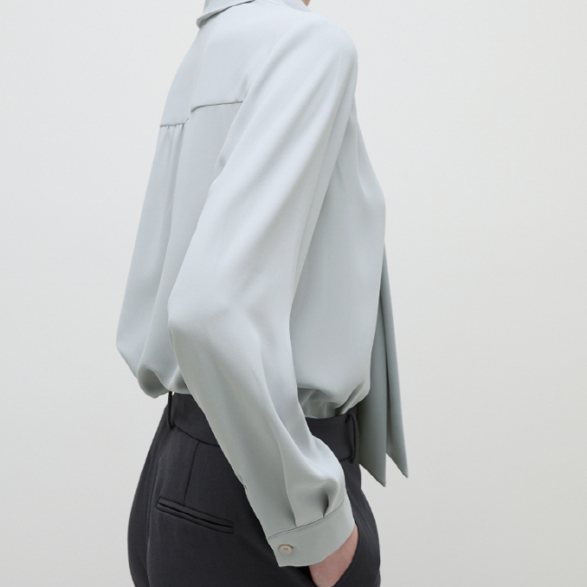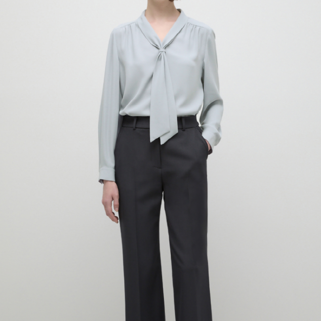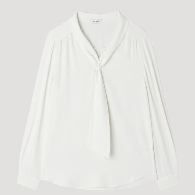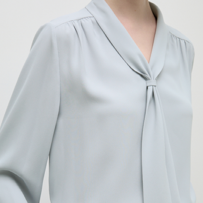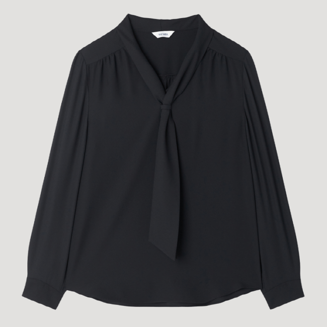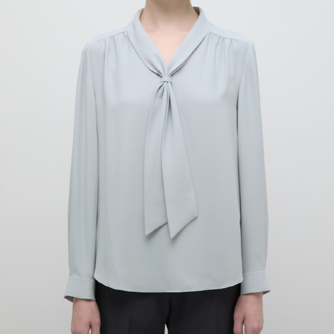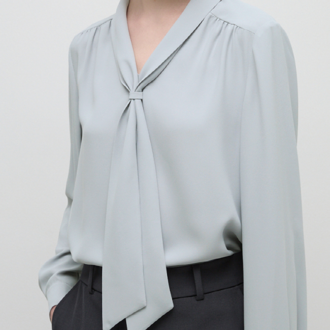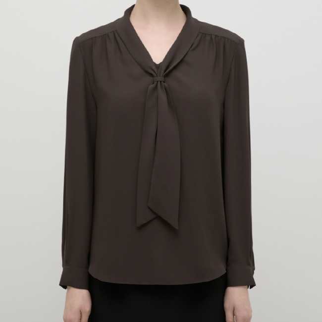 어꺠 라이의 셔링 디테일과 타이넥 디자인으로 포인트를 준 블라우스입니다