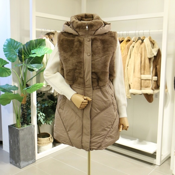 몸판과 목선의 퍼 배색이 멋스러운 후드 롱패딩베스트입니다