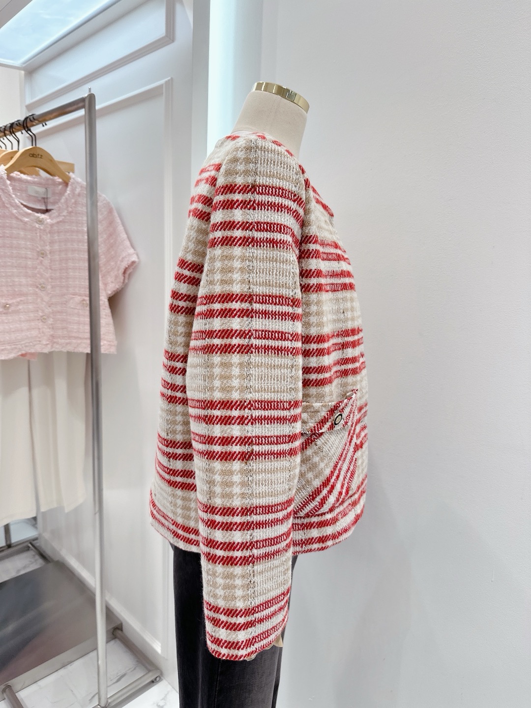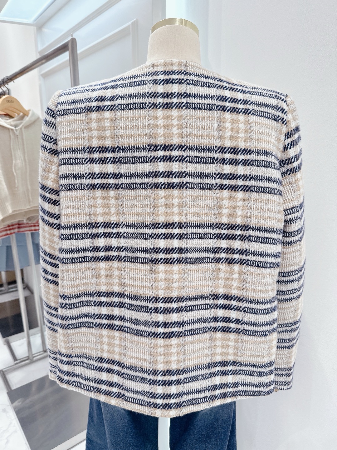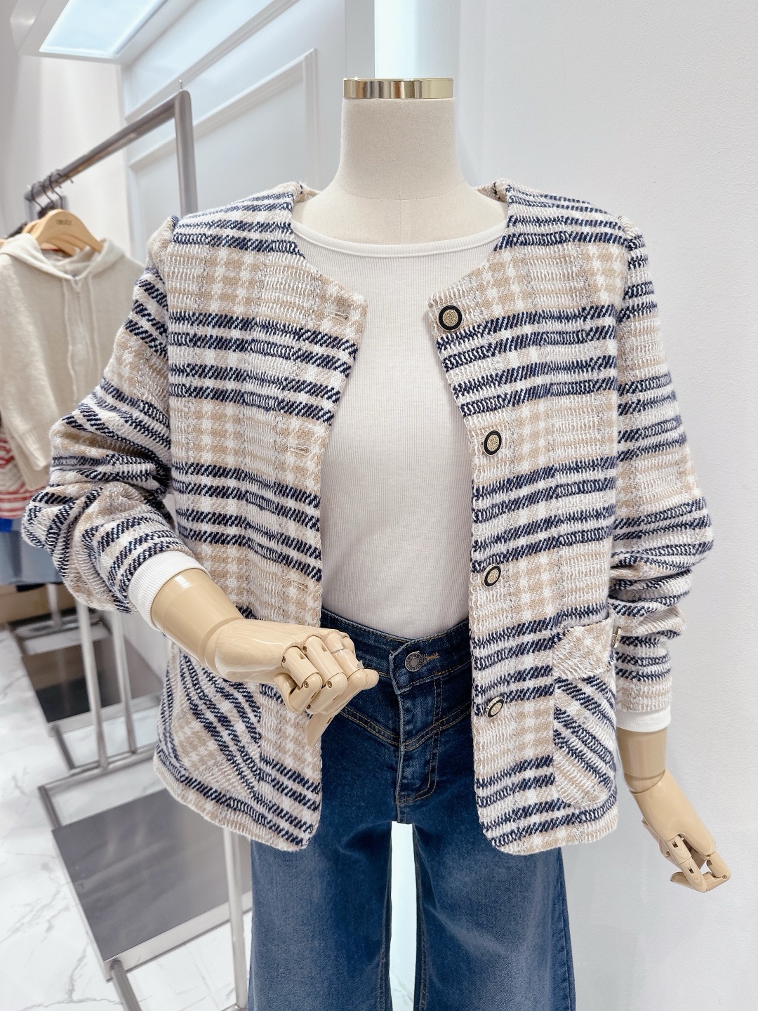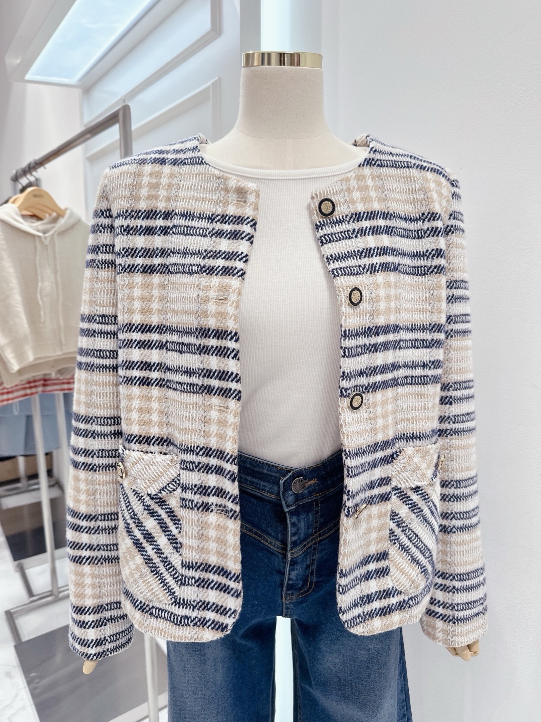 라운드 넥으로 고급스러운 분위기의 자켓입니다.