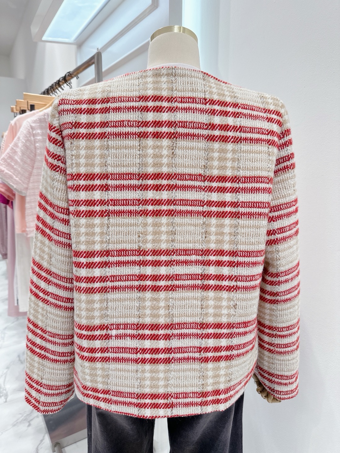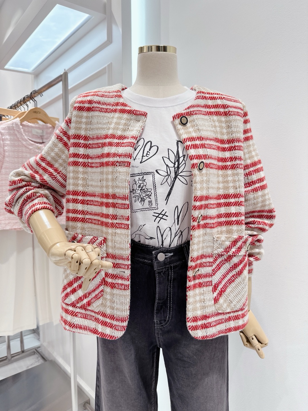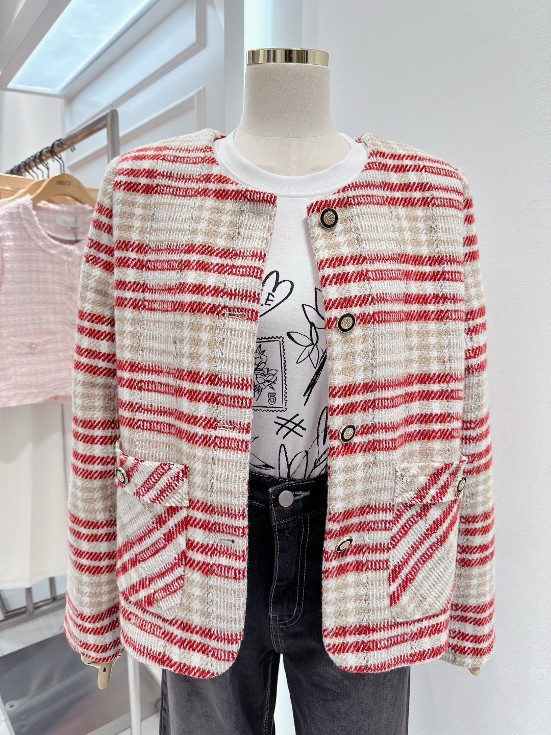 라운드 넥으로 고급스러운 분위기의 자켓입니다.