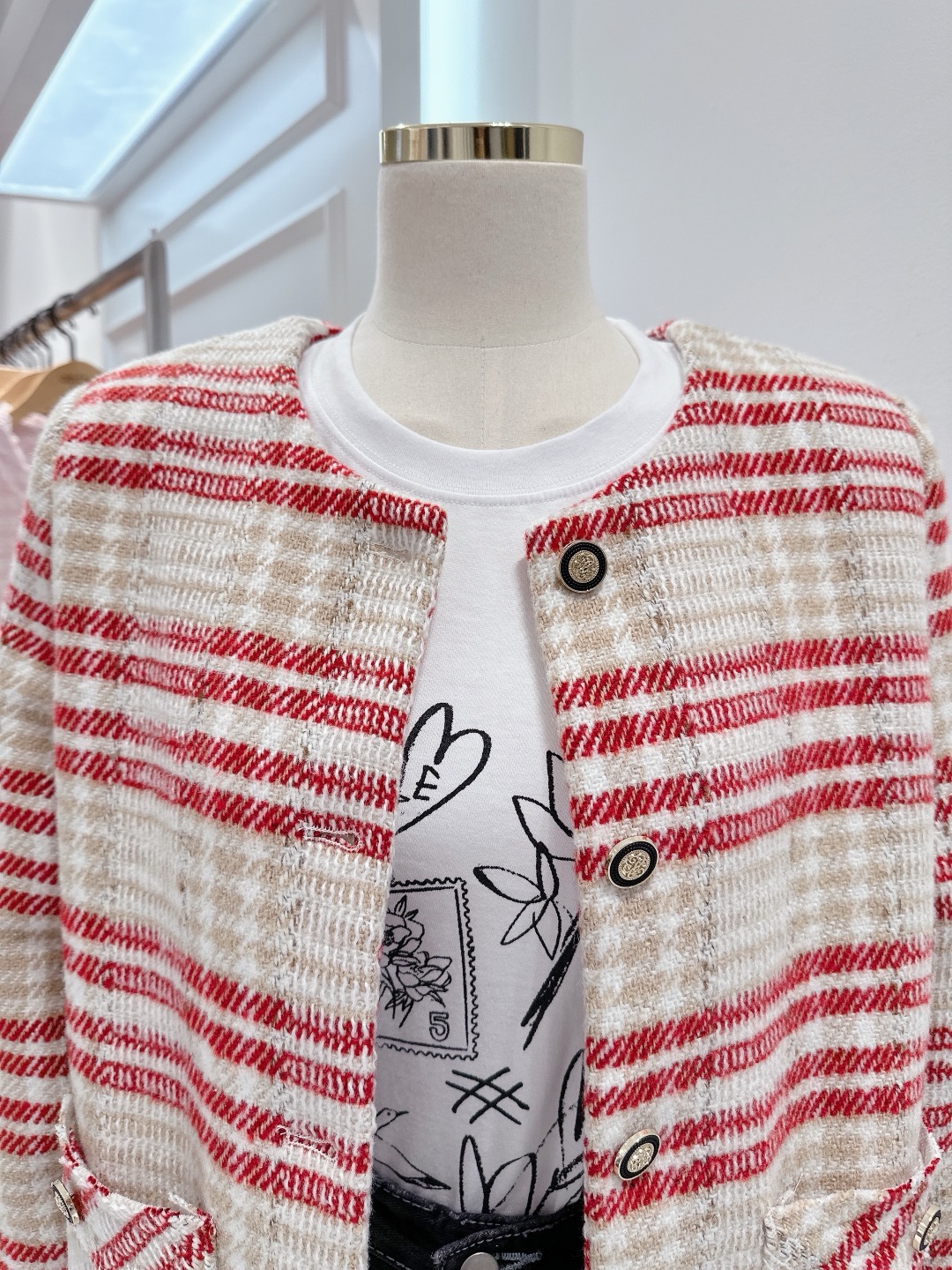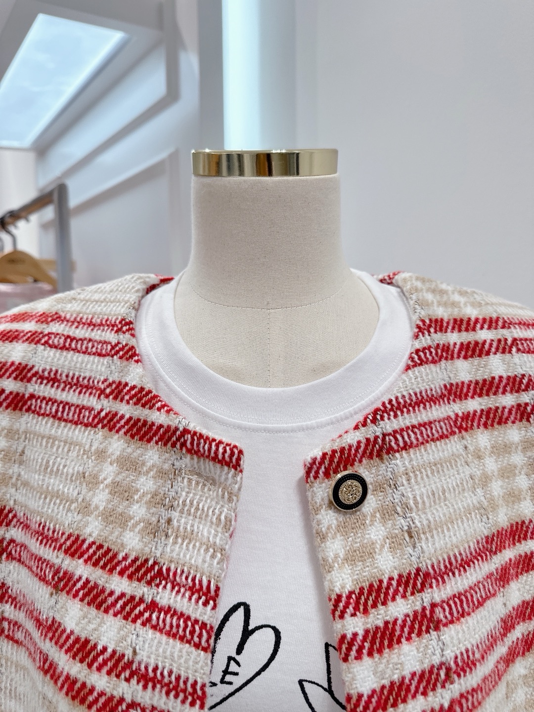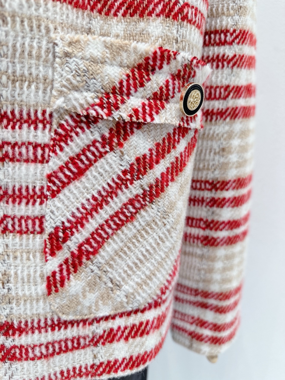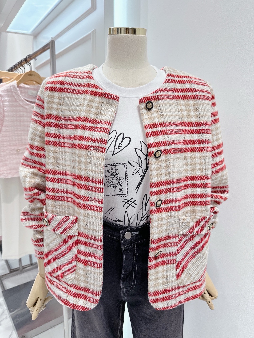 라운드 넥으로 고급스러운 분위기의 자켓입니다.