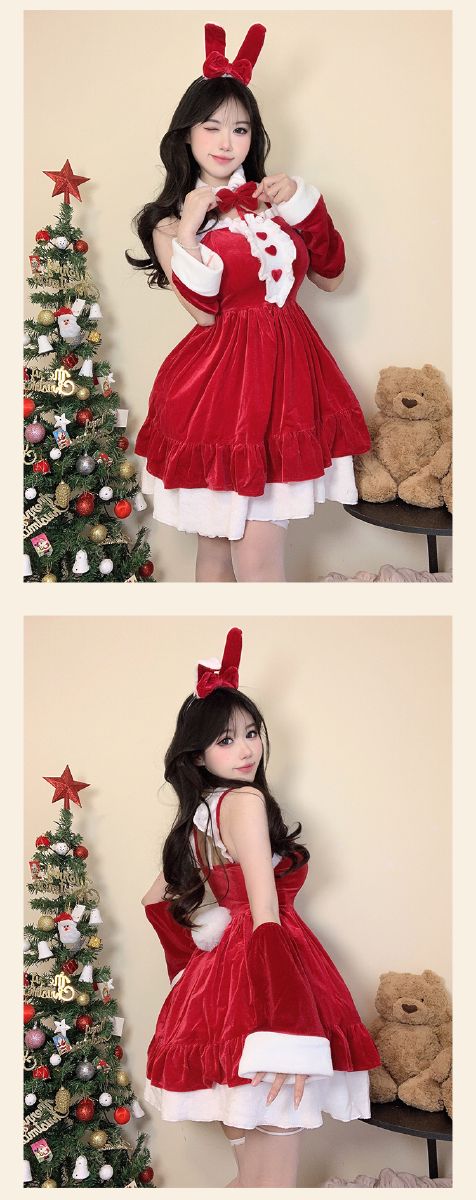 9844레드[원피스+팔소매+타이+귀+화이트스타킹]
