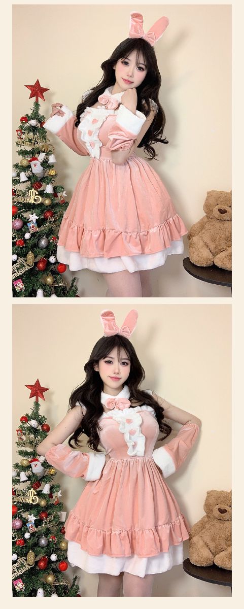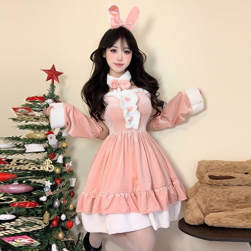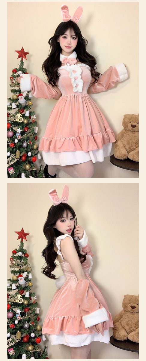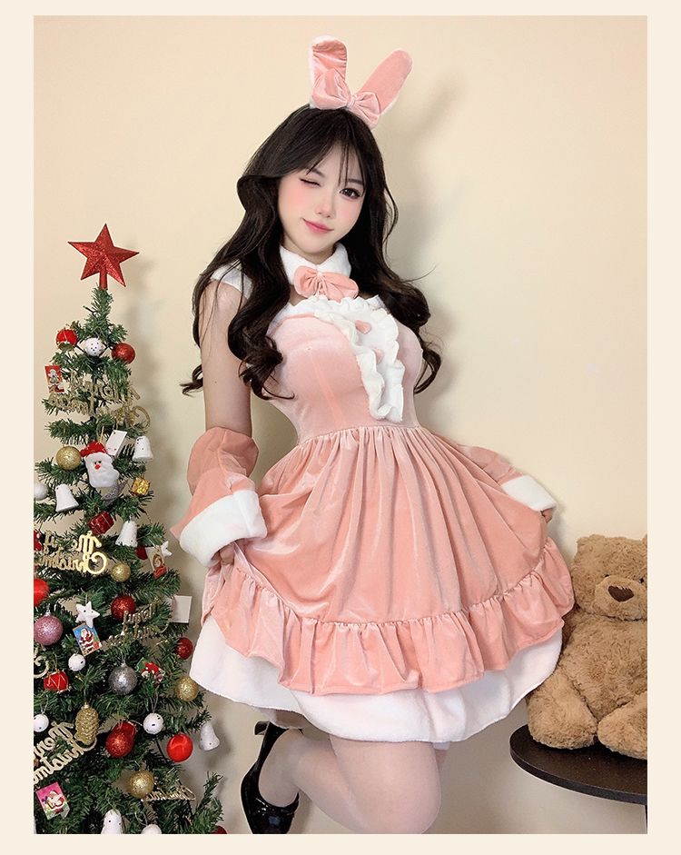 9844핑크[원피스+팔소매+타이+귀+화이트스타킹]