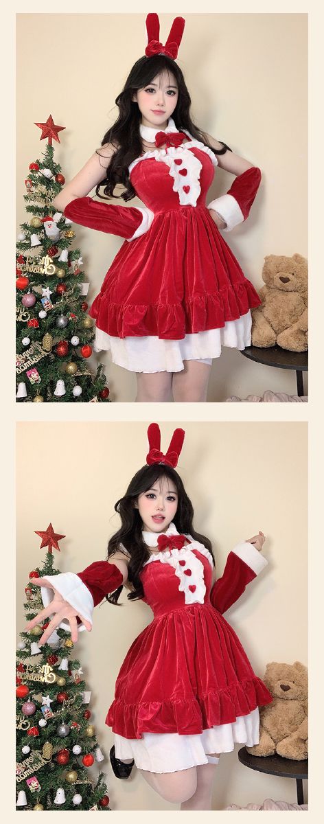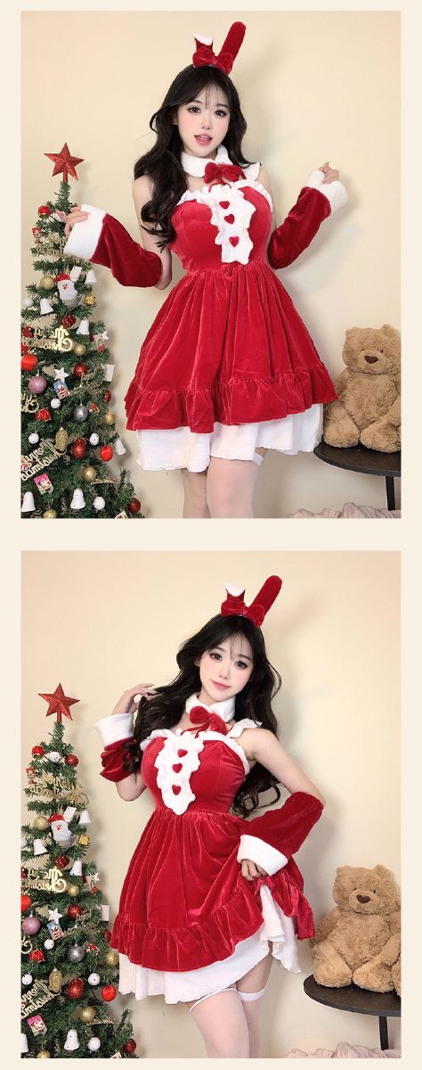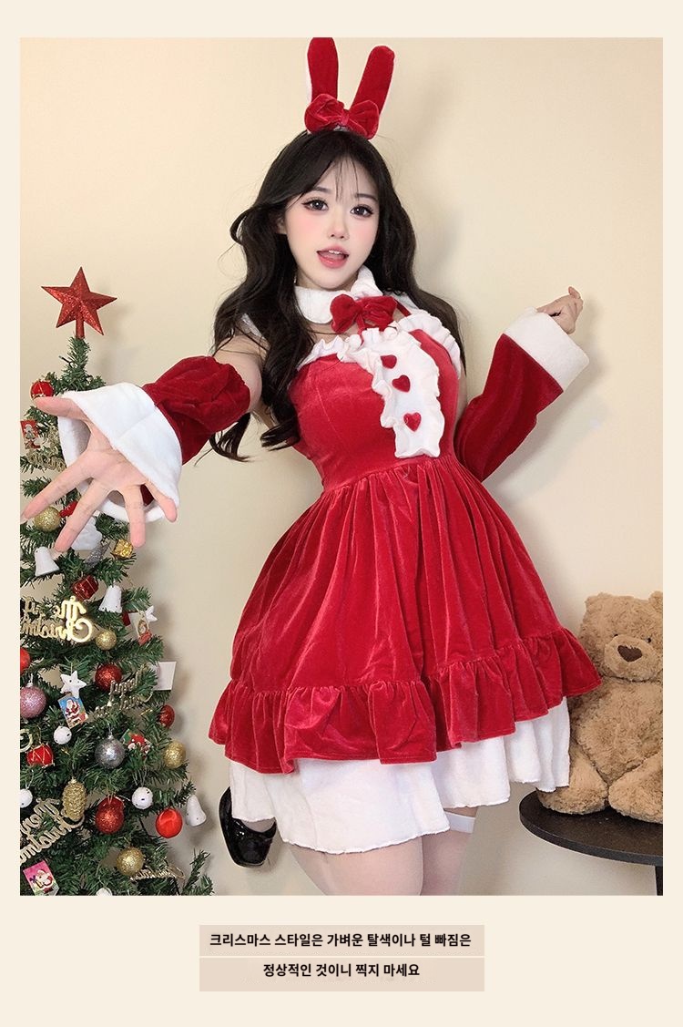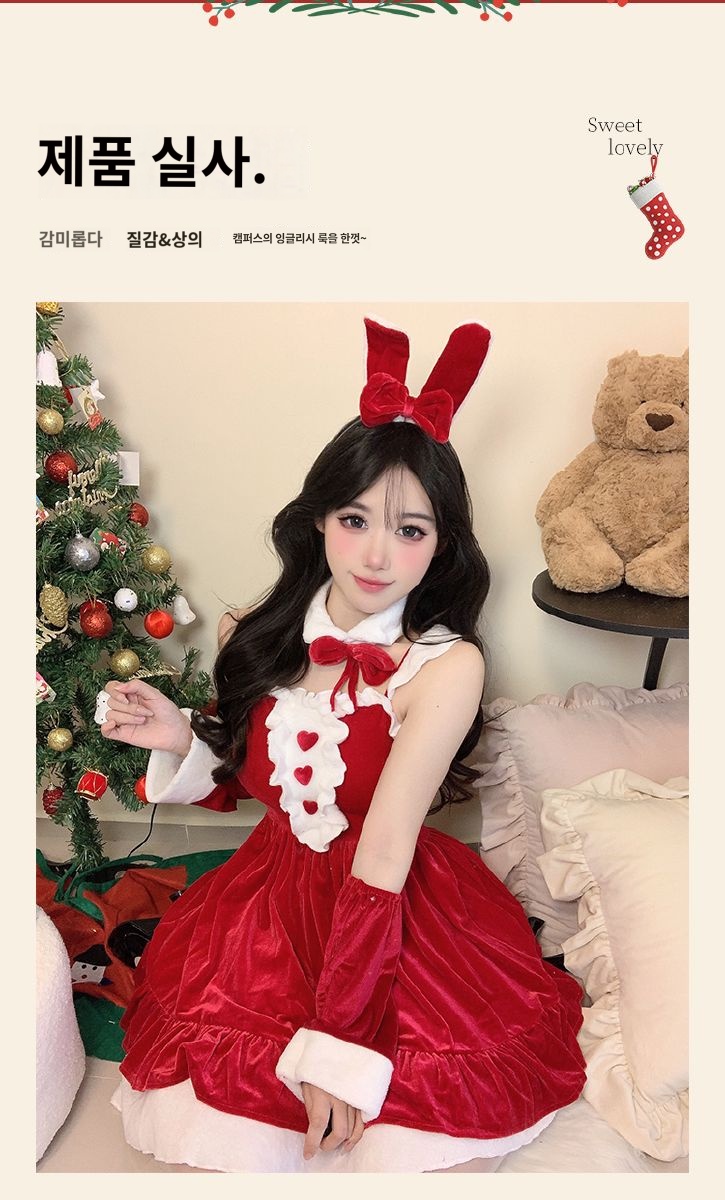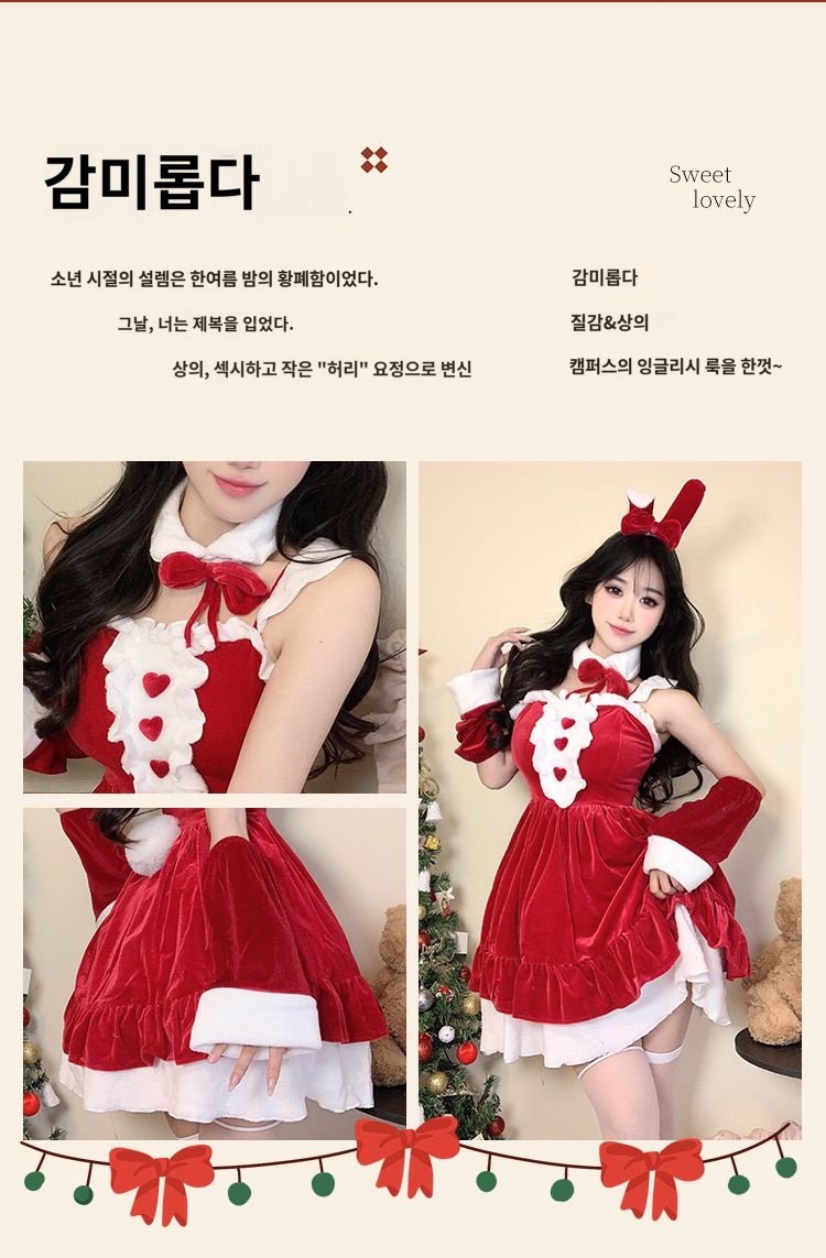 9843레드[원피스+팔소매+타이+귀+화이트스타킹]