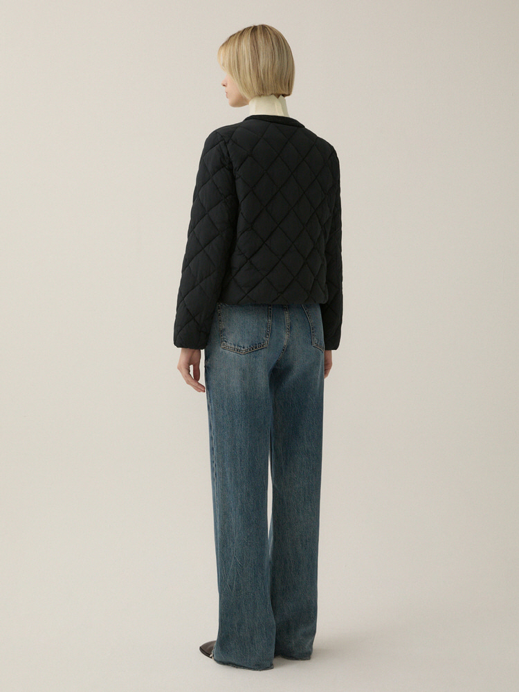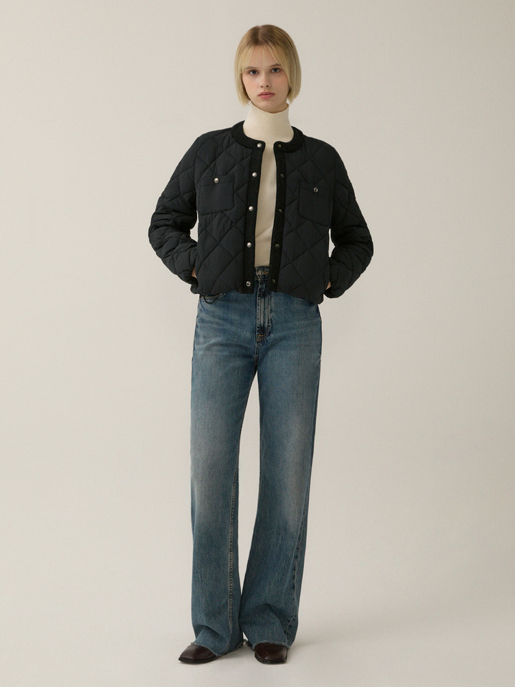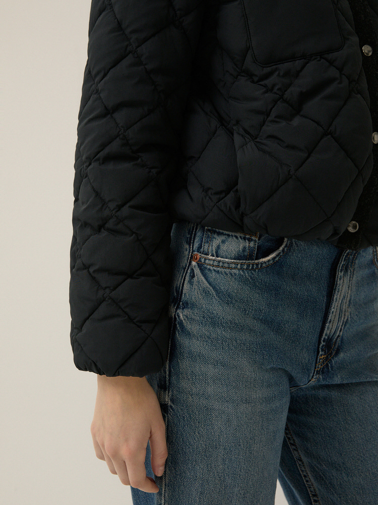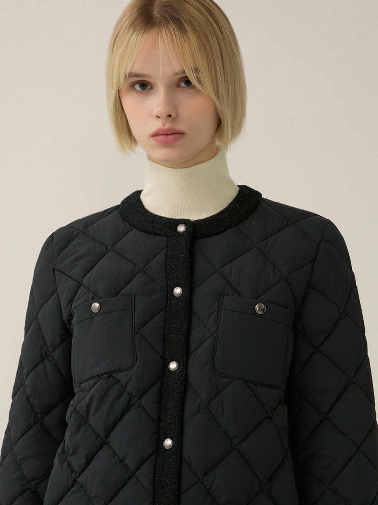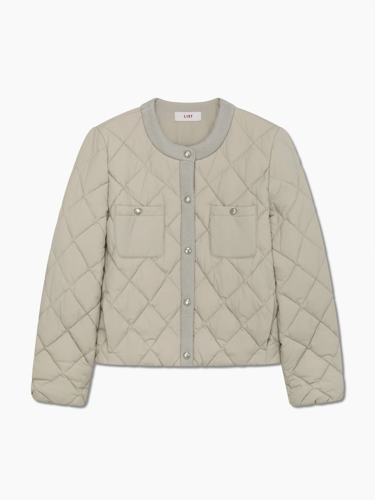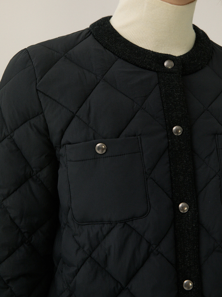 퀄팅 디자인의 원단에 니트 배색으로 포인트를 준 라운드넥 점퍼입니다
