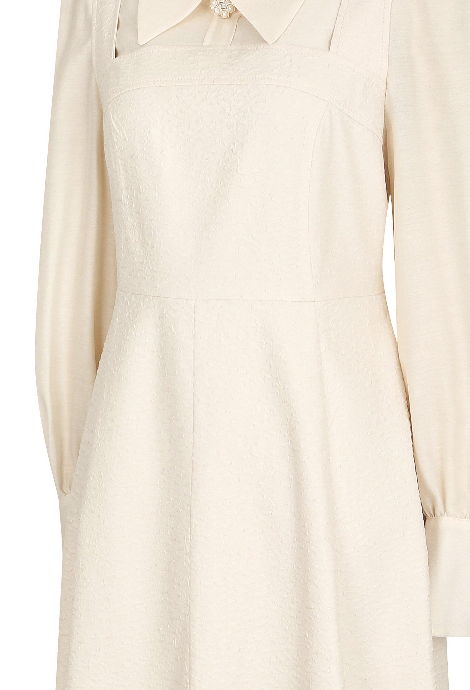 네크라인과 슬리브 소재 배색으로 단품 레이어드 스타일을 즐길 수 있는 원피스입니다.