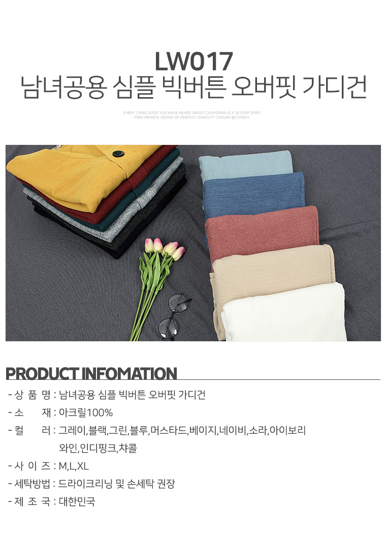탑보이탑보이 남녀공용 심플 빅버튼 오버핏 가디건 (LW017)