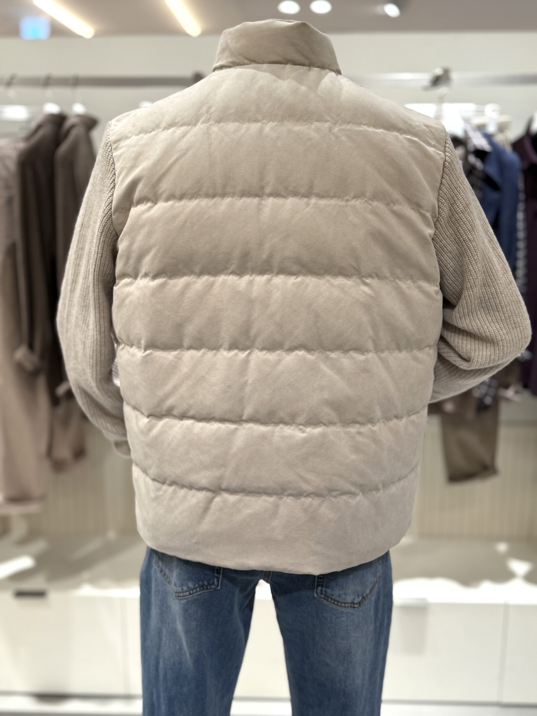 | 제품소재 | 겉감 : 합성가죽 카라 배색 : 모 44%, 나일론 32%, 폴리에스터 23%, 폴리우레탄 1% 소매 배색 : 모 50%, 나일론 37%, 폴리에스터 13% 안감1 : 나일론 100% 안감2(충전재백) : 폴리에스터 100% 주머니감 : 폴리에스터 100% 충전재(오리) : 솜털 80%, 깃털 20% |