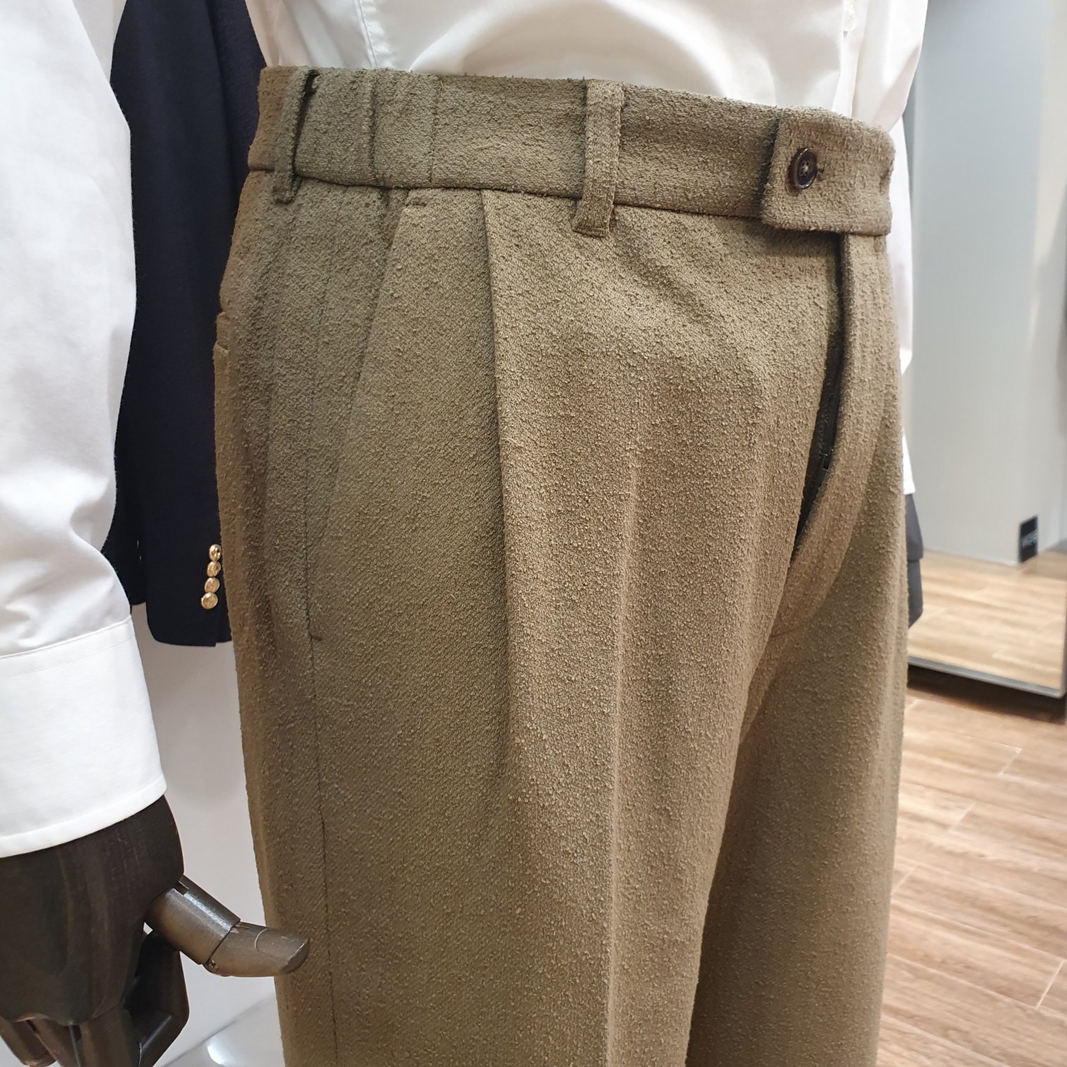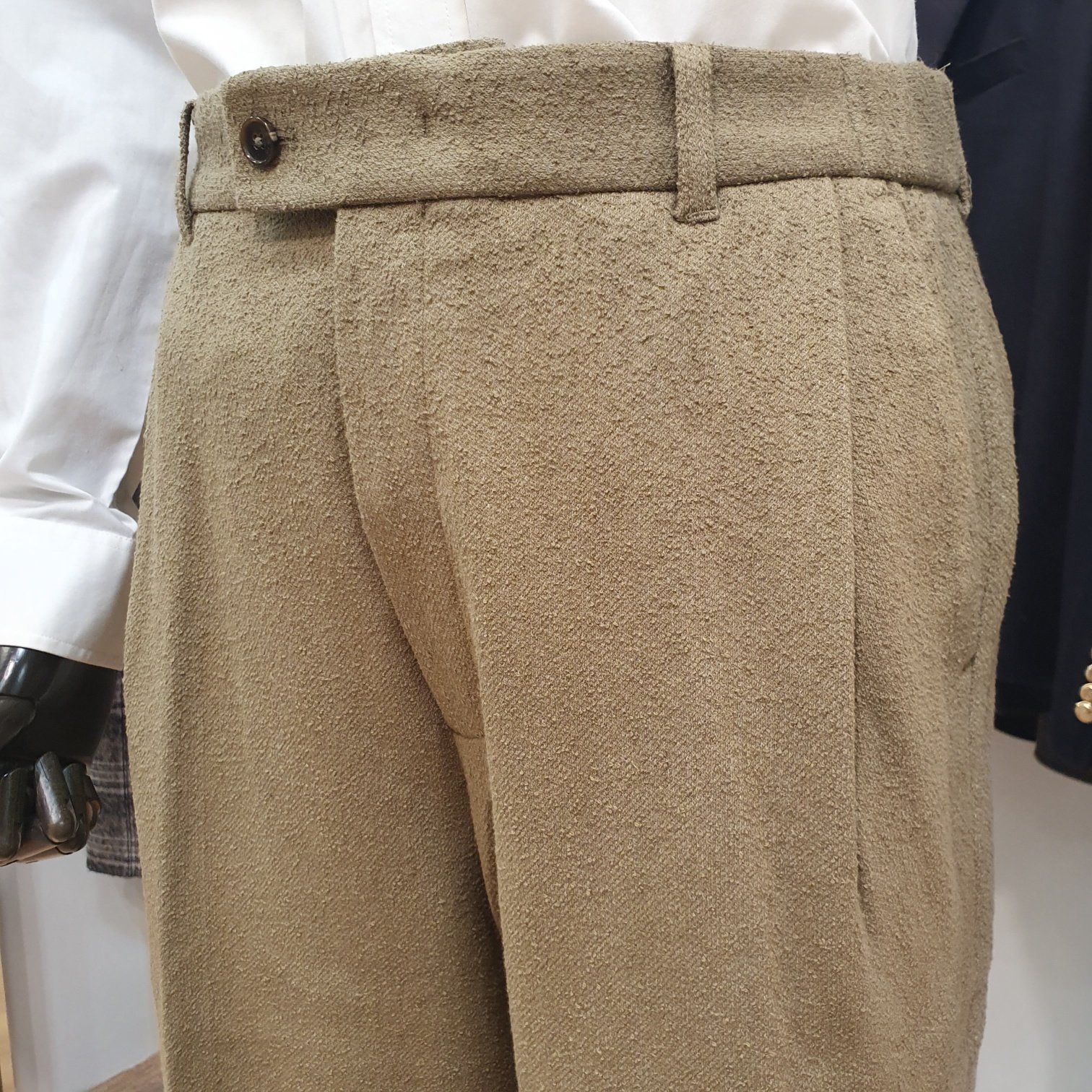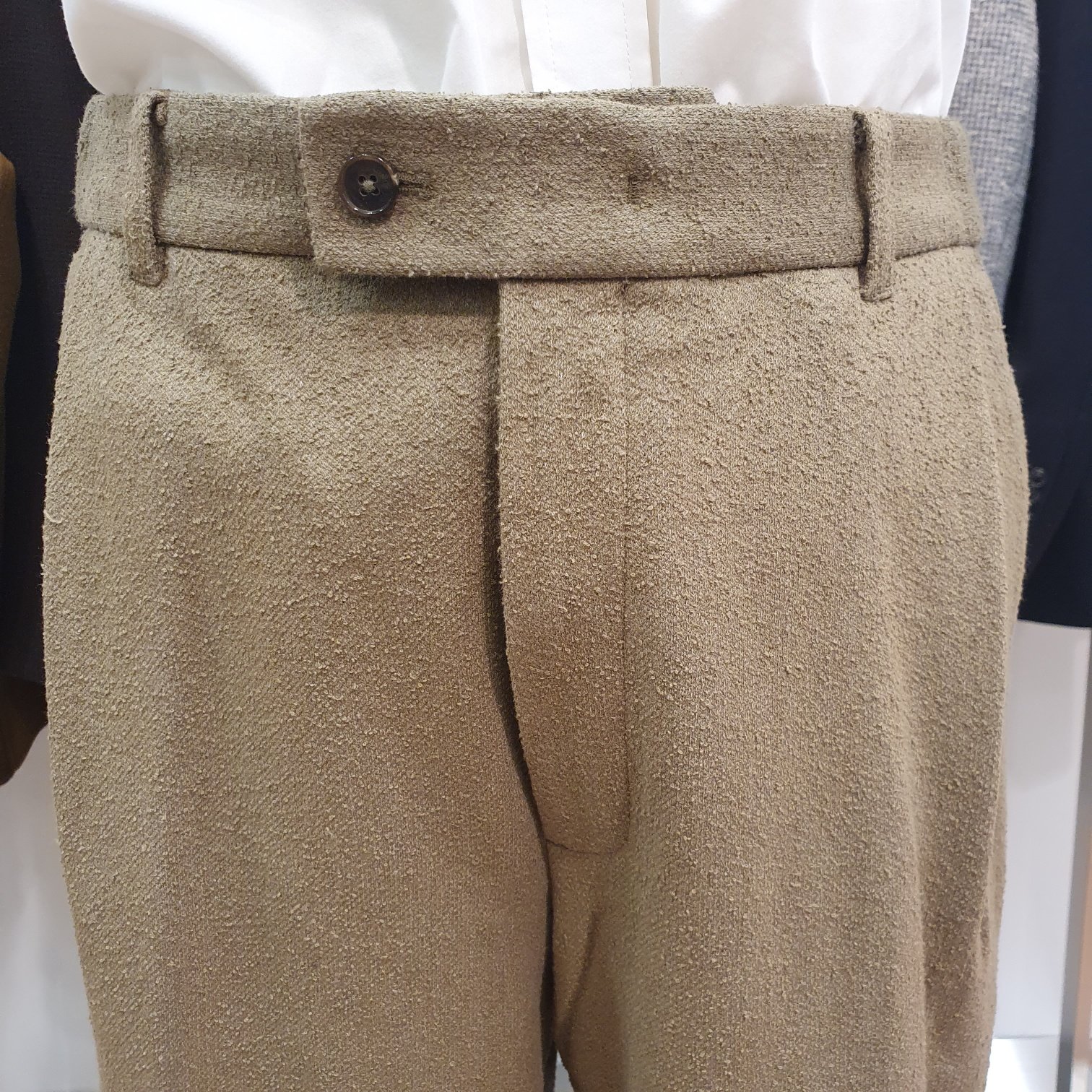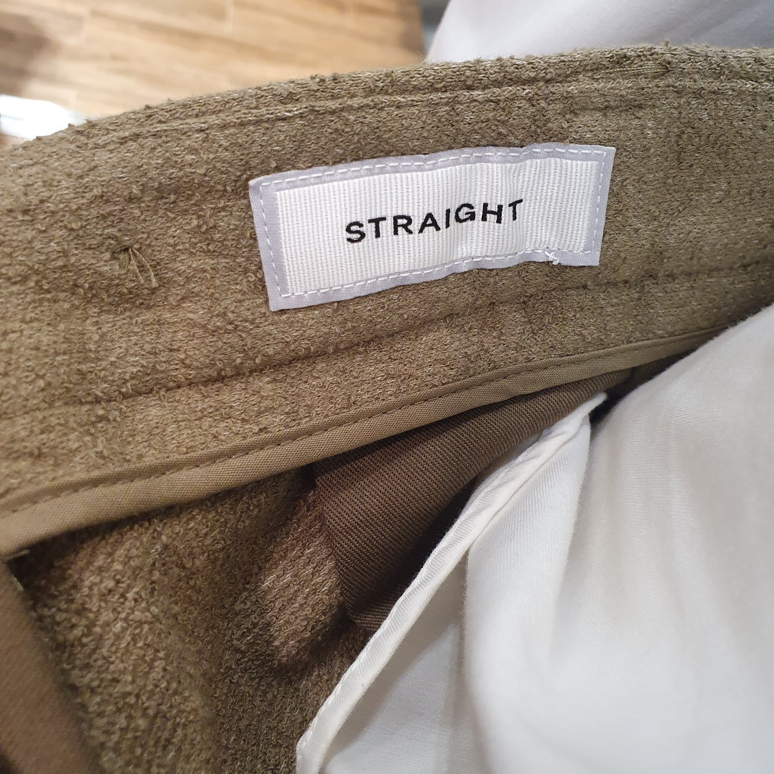 카키 테리 부클 울혼방 와이드 스트레이트핏 팬츠입니다.