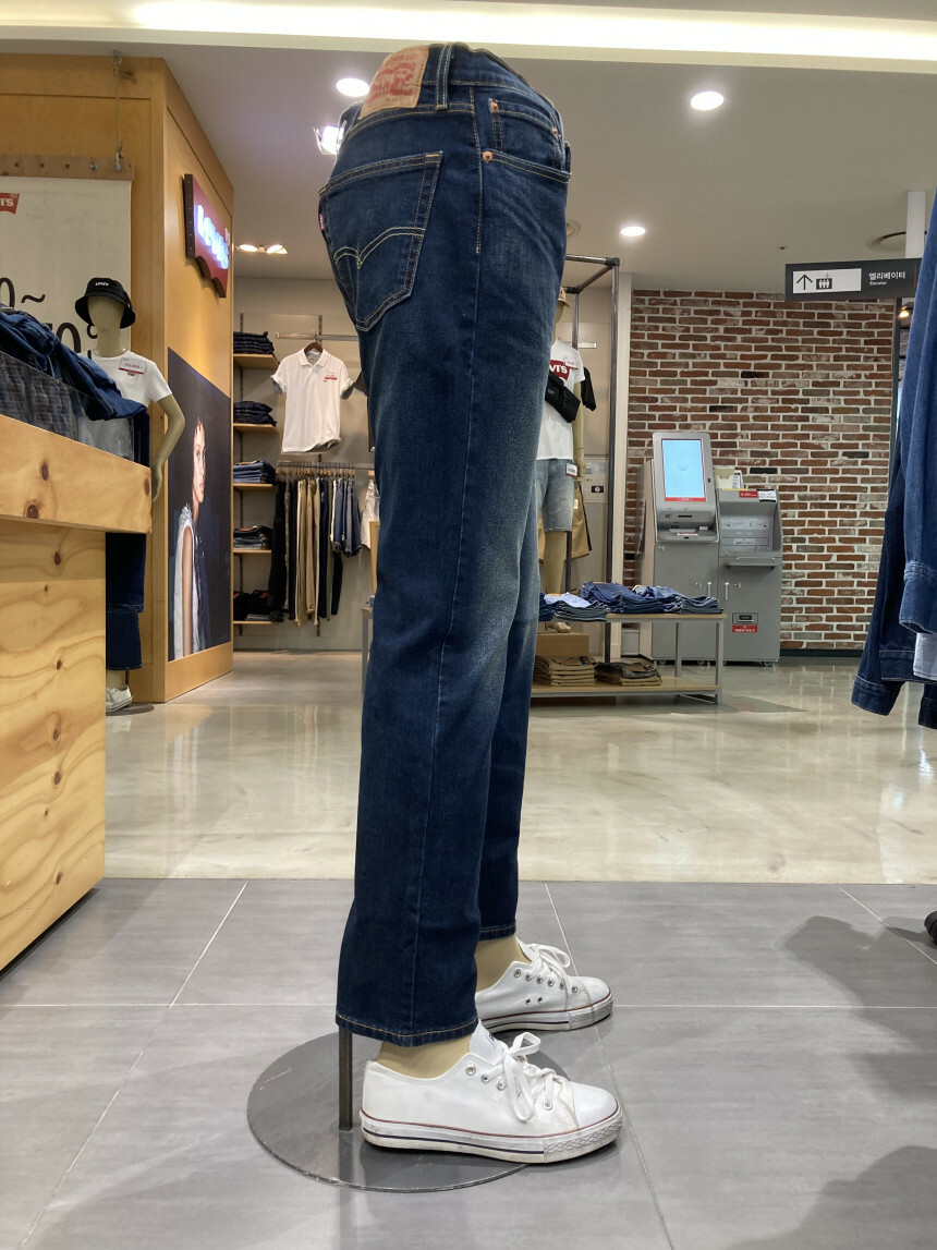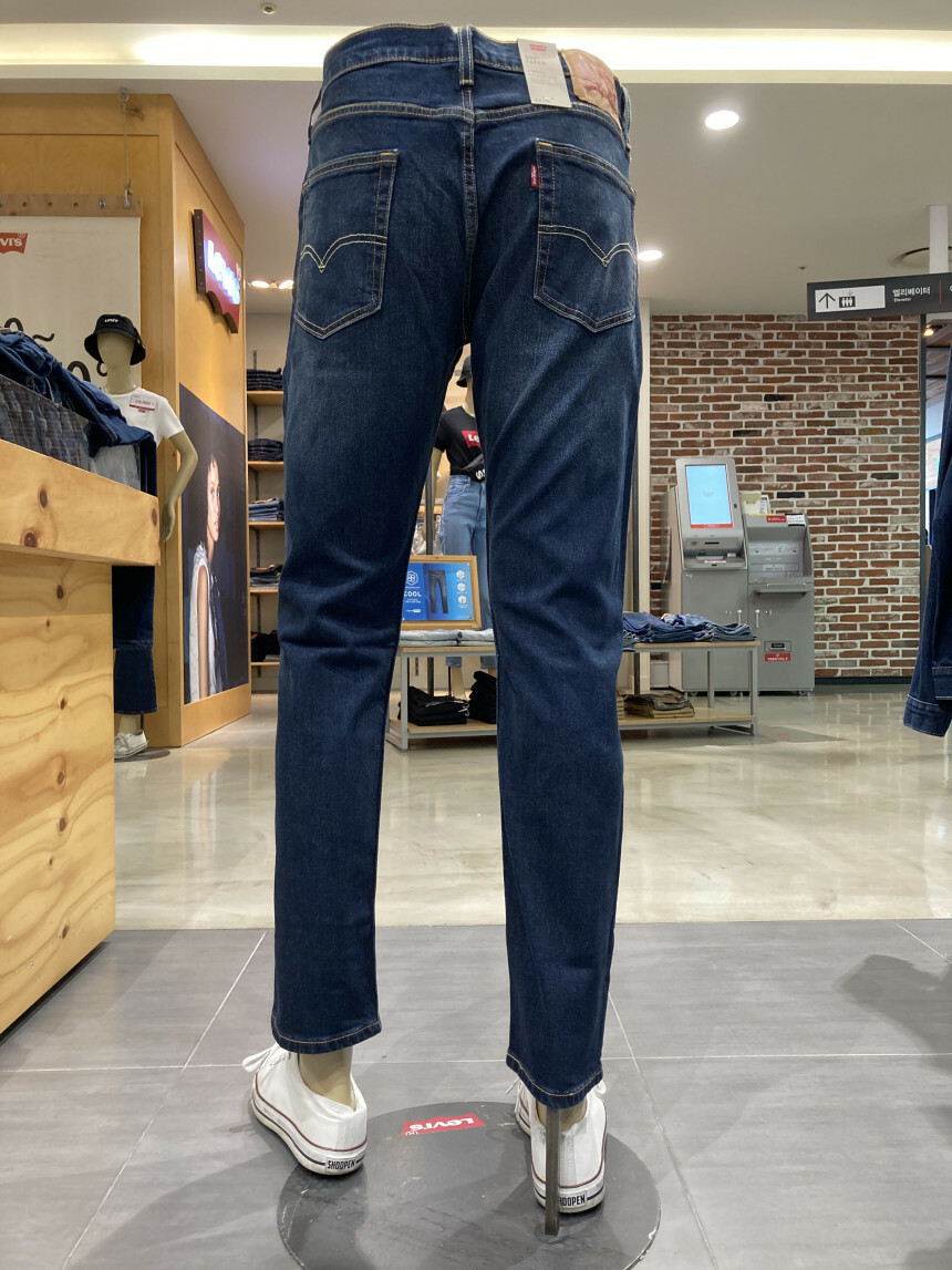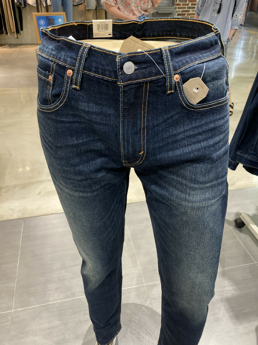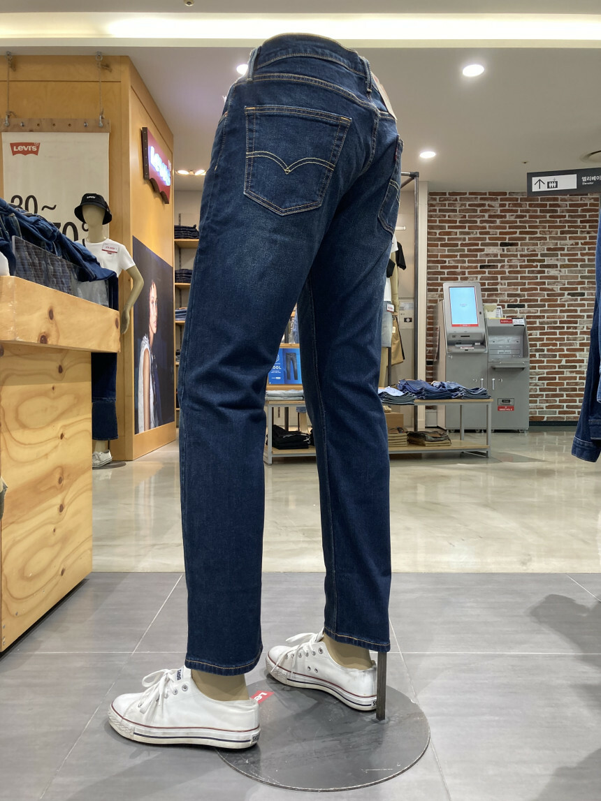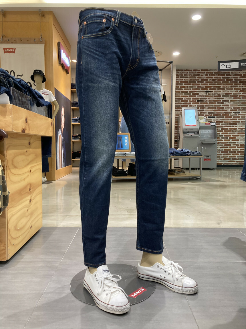 다크블루컬러에 워싱이 들어가있는 남성 502 테이퍼 청바지입니다.
