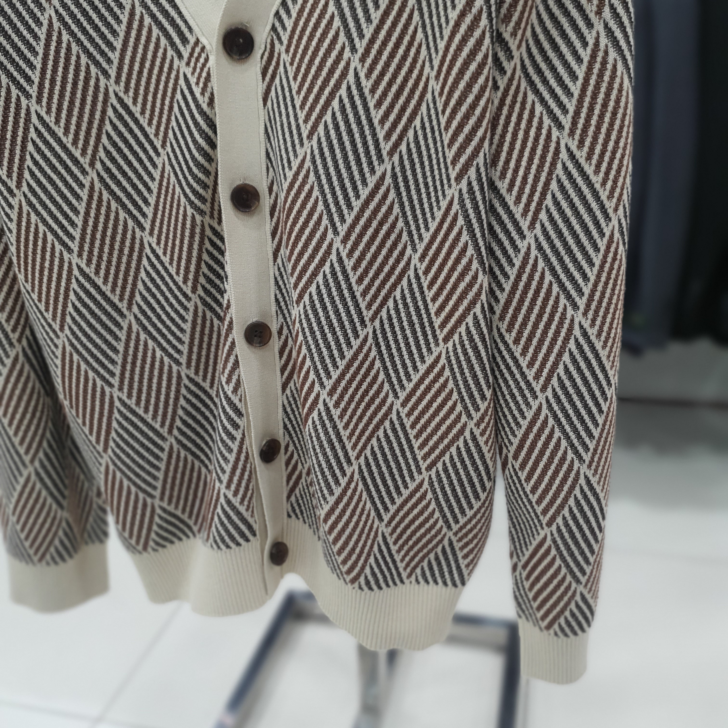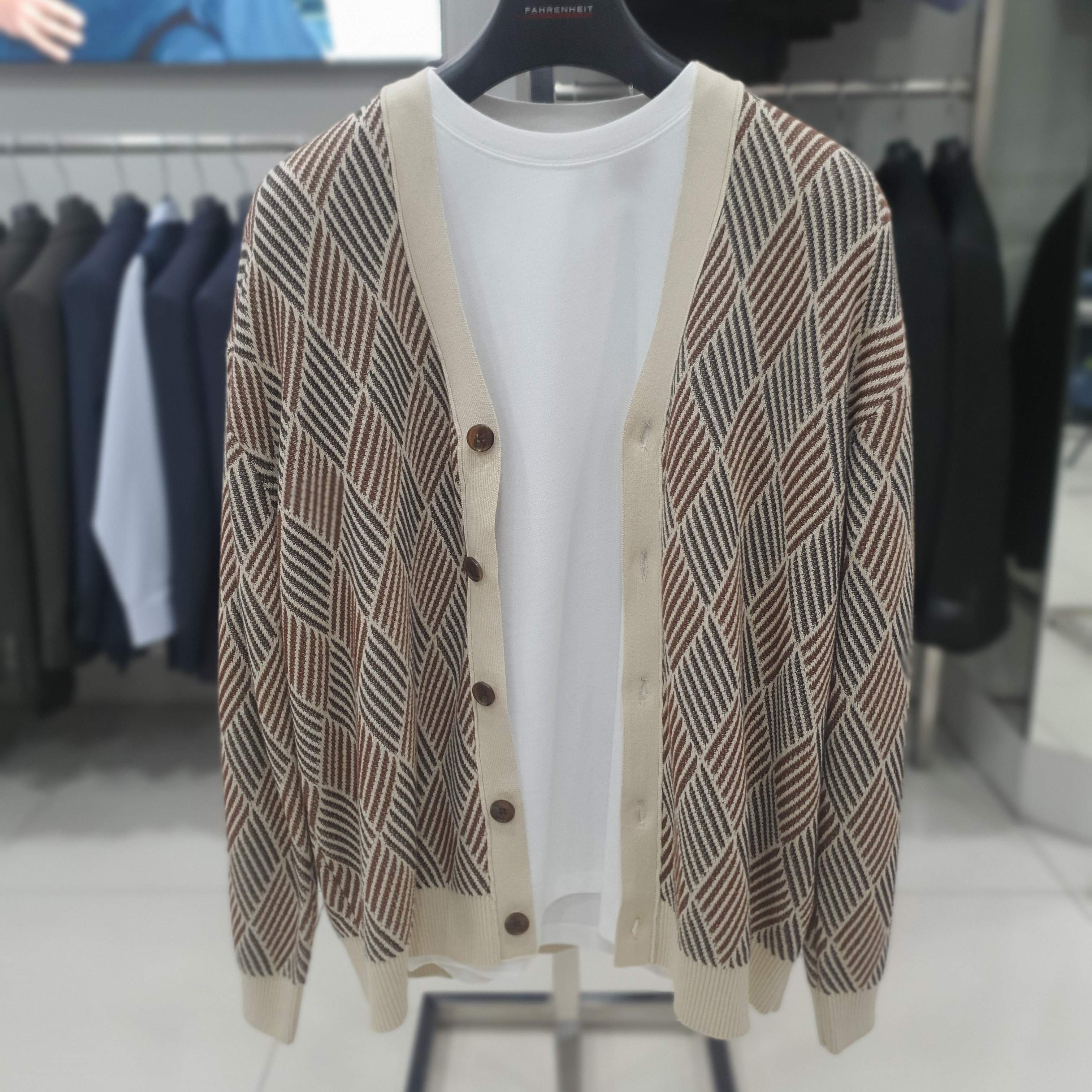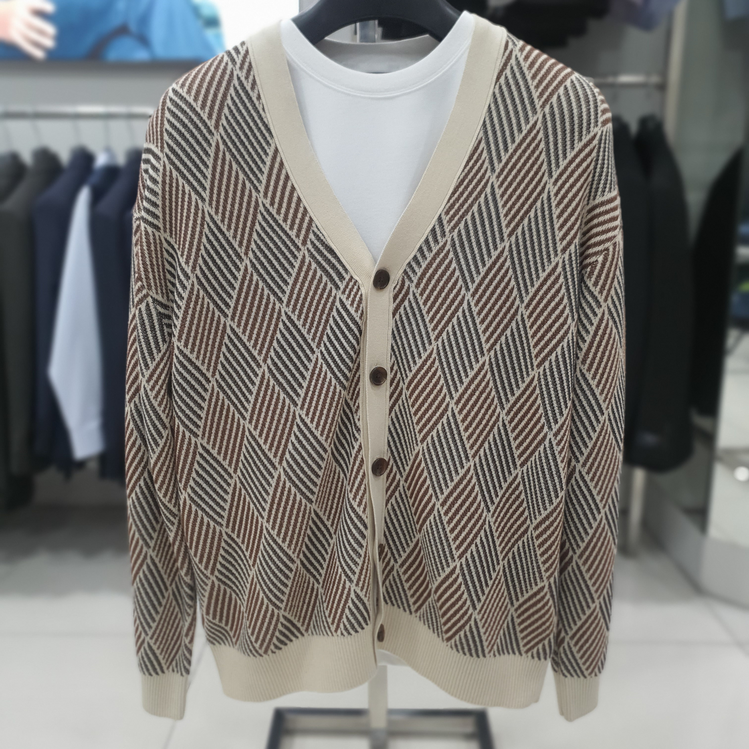 변형 패턴 가디건 면100 강연사를 사용하여 부드럽고 시원한 착용감을 제공합니다. 단조롭지 않은 변형 자가드 기법을 활용해 아가일 패턴을 표현한 제품입니다. 간절기에 데일리하게 활용하기 좋은 아이템 입니다.