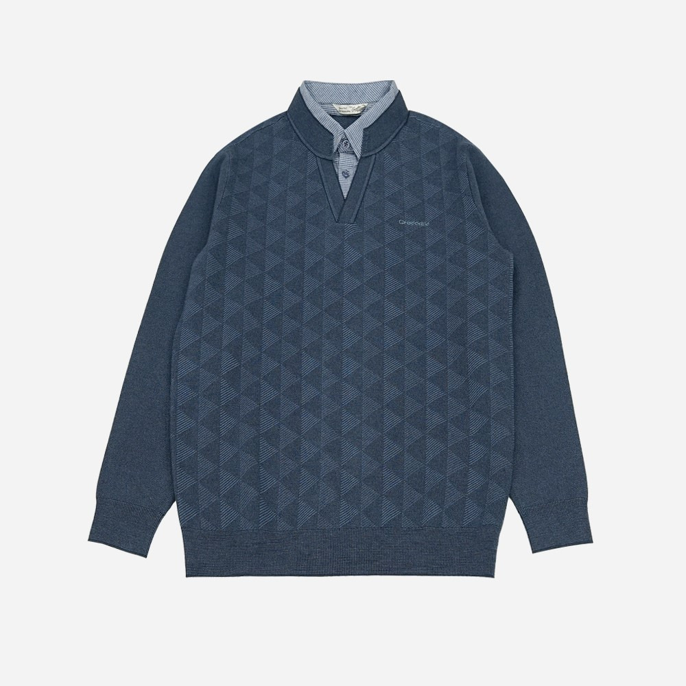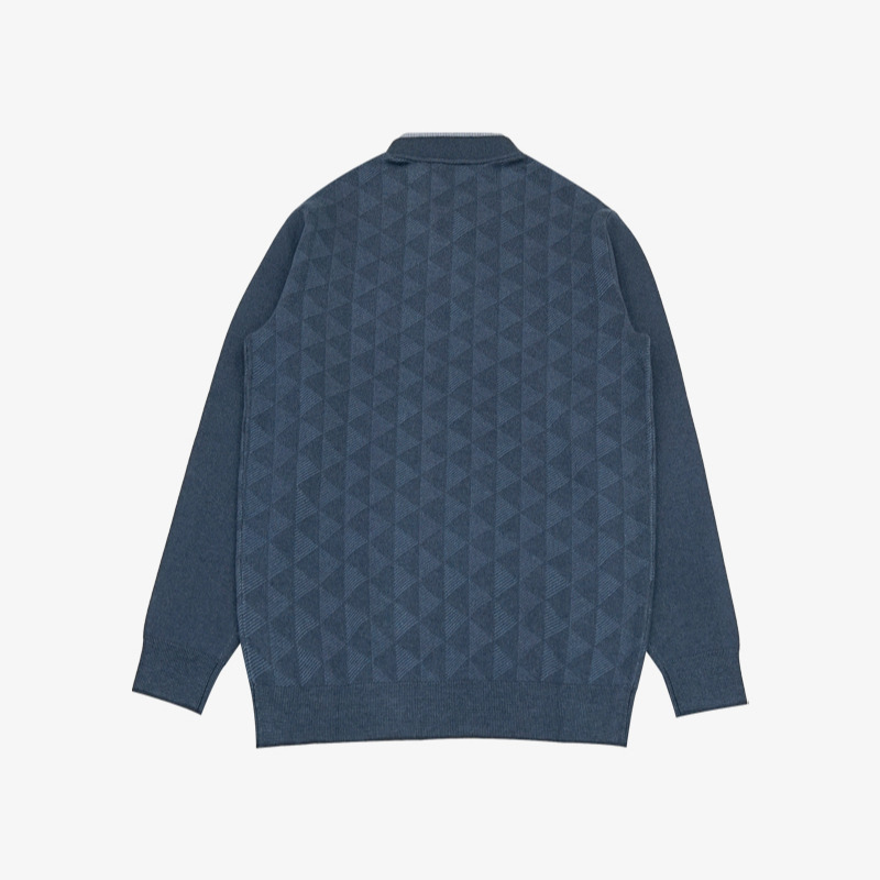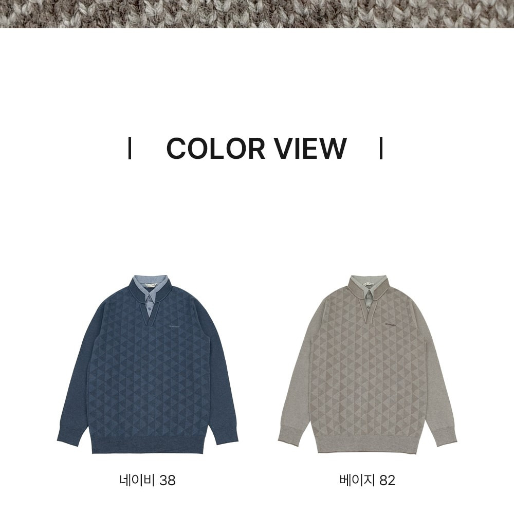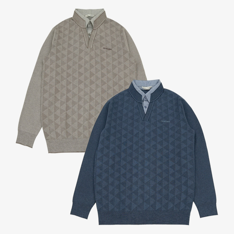 고급스러운 다이아몬드 조직 패턴이 돋보이는 레이어드 니트입니다. 톤온톤 컬러와 배색 디테일이 세련된 무드를 연출하며, 셔츠 칼라 레이어드 디자인으로 포멀하면서도 트렌디한 스타일을 완성했습니다. 가슴 부분의 로고 자수가 은은한 포인트를 더해 브랜드 아이덴티티를 강조하고, 립 조직으로 마무리된 소매와 밑단이 안정된 실루엣을 잡아줍니다. 단품으로도 코디가 용이하며, 자켓이나 아우터 속 이너로 활용해도 스타일리시한 코디가 가능한 아이템입니다.
