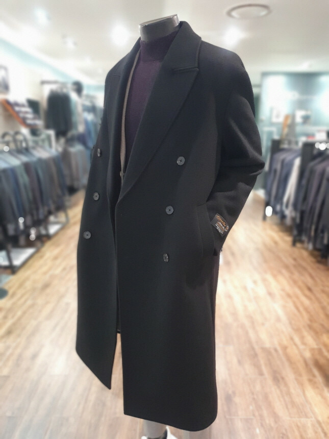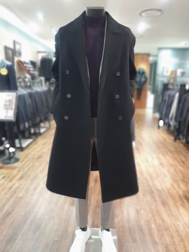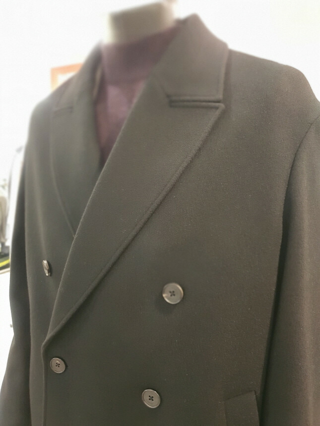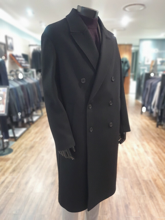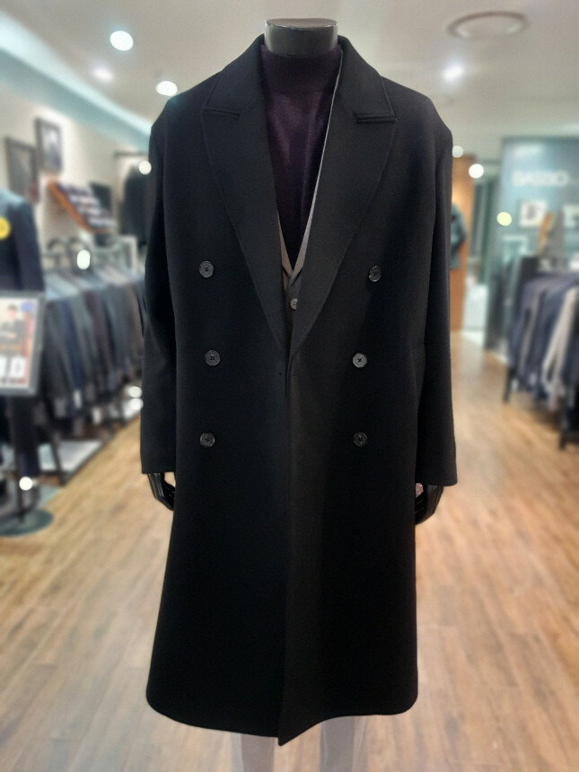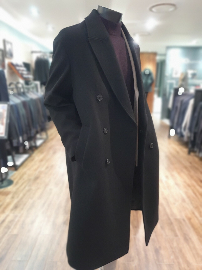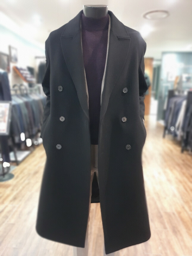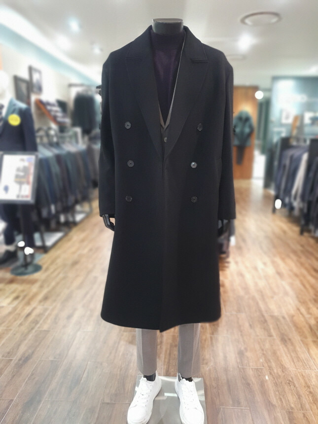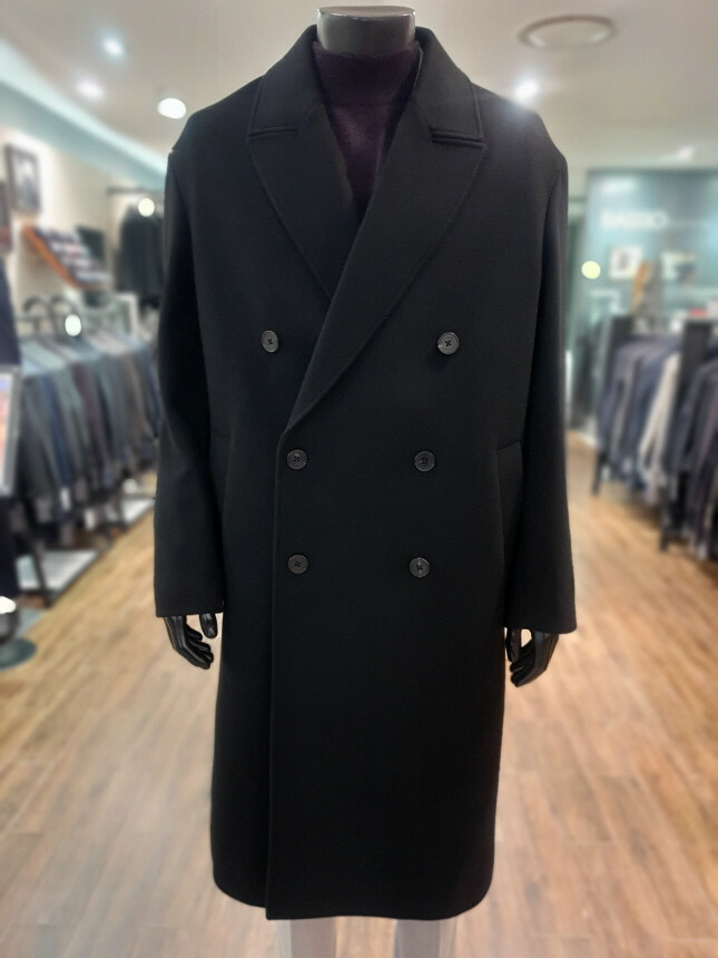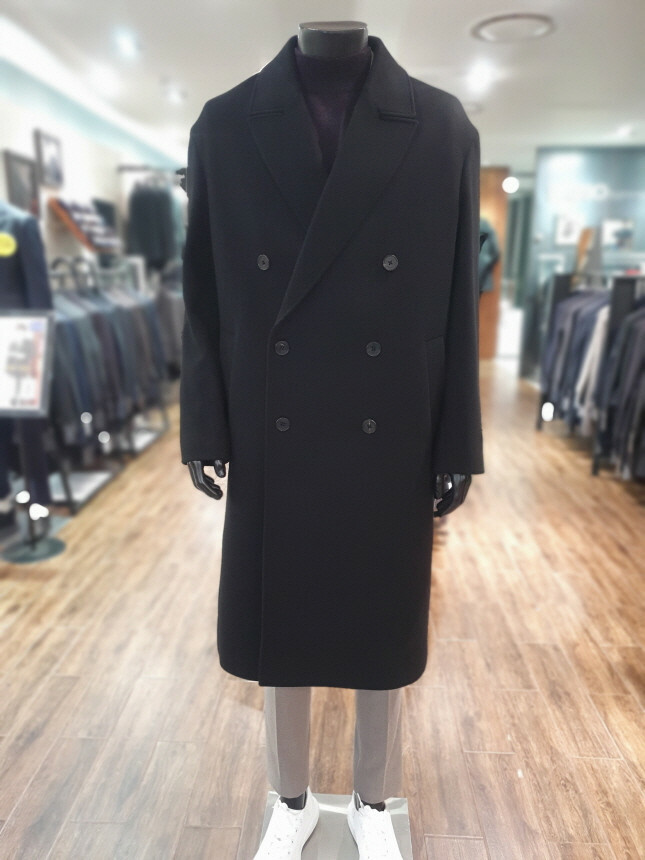 연출되는 헤비오버핏 더블 롱코트 입니다