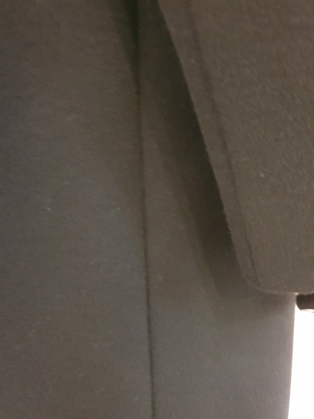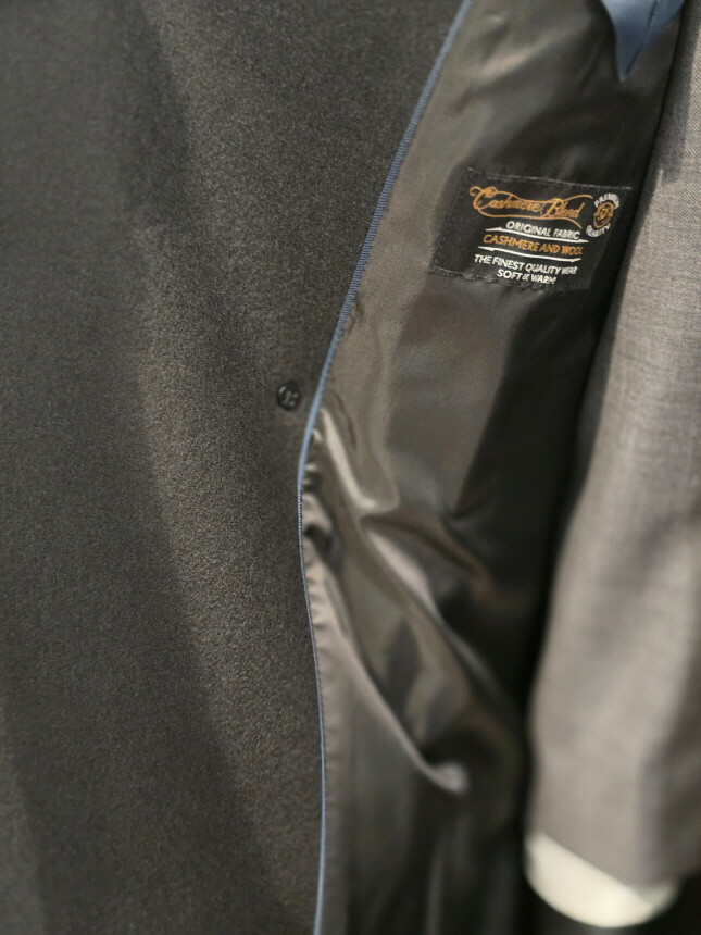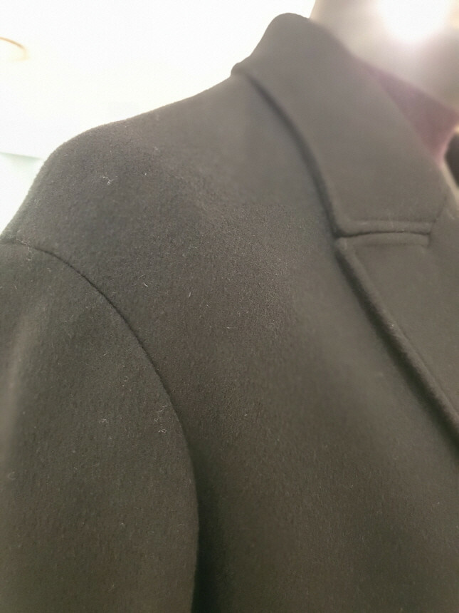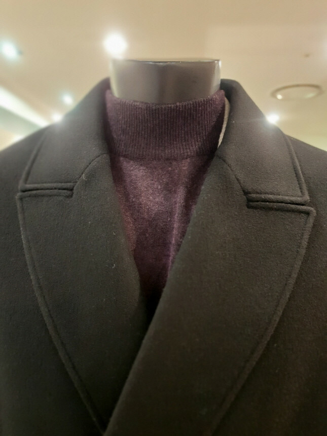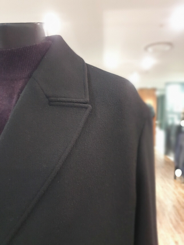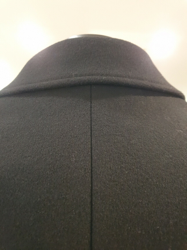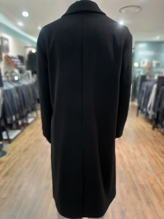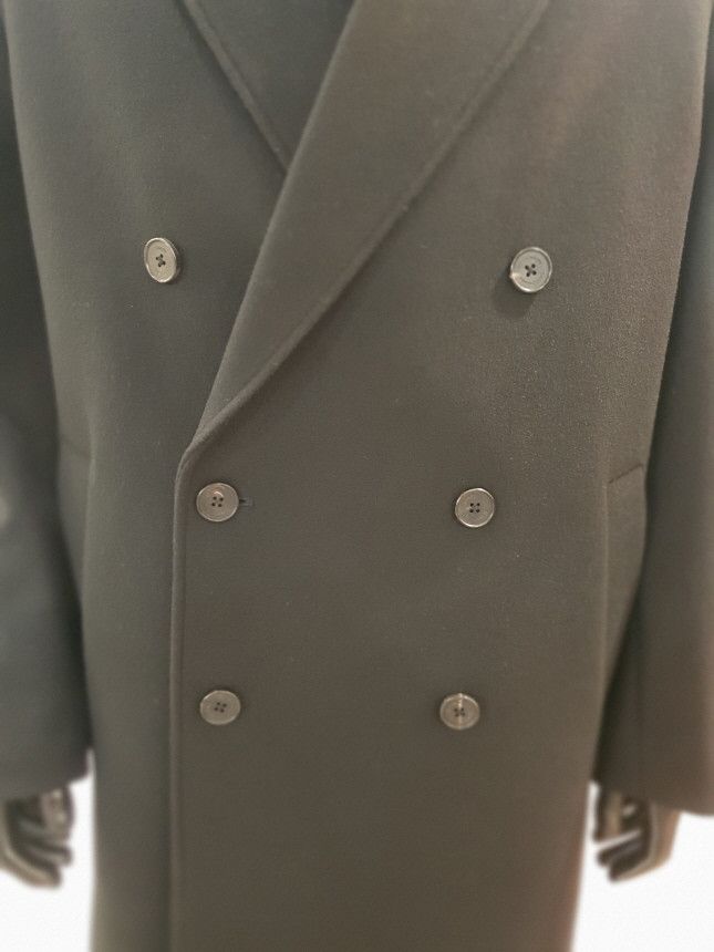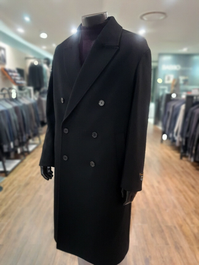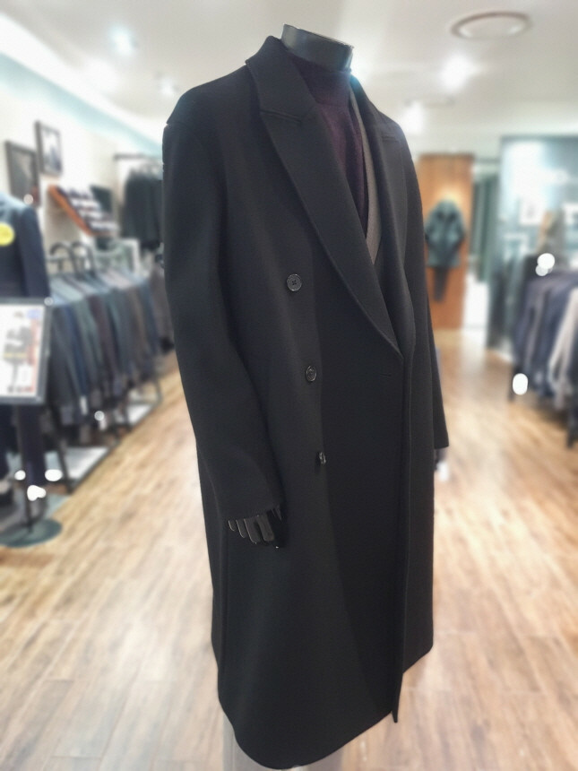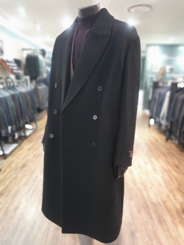 연출되는 헤비오버핏 더블 롱코트 입니다