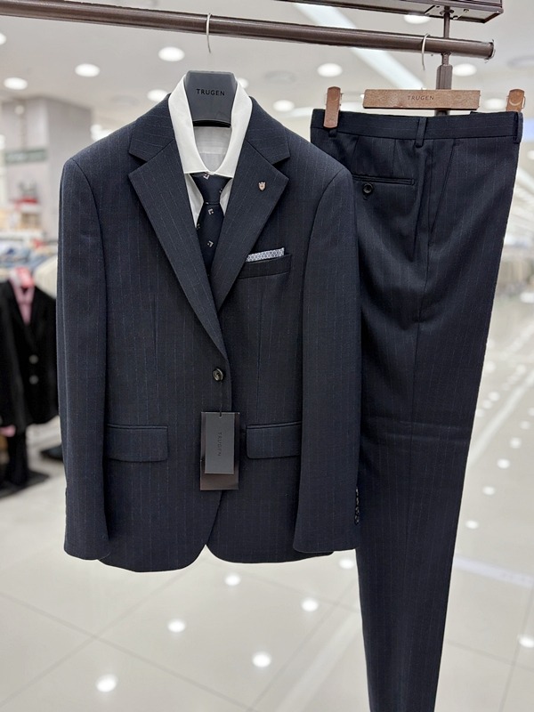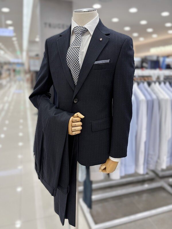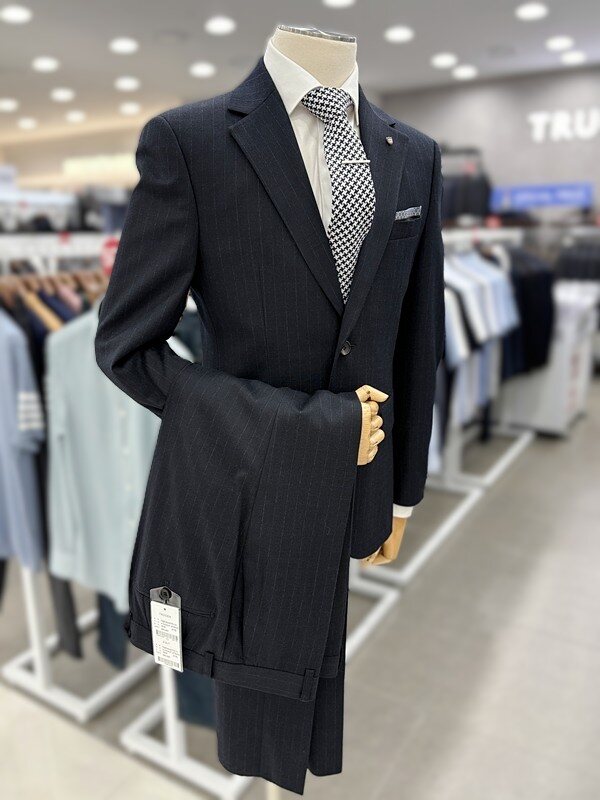 투톤 트윌조직의 고급스러운 네이비 스트라이프 컬러 정장 세트