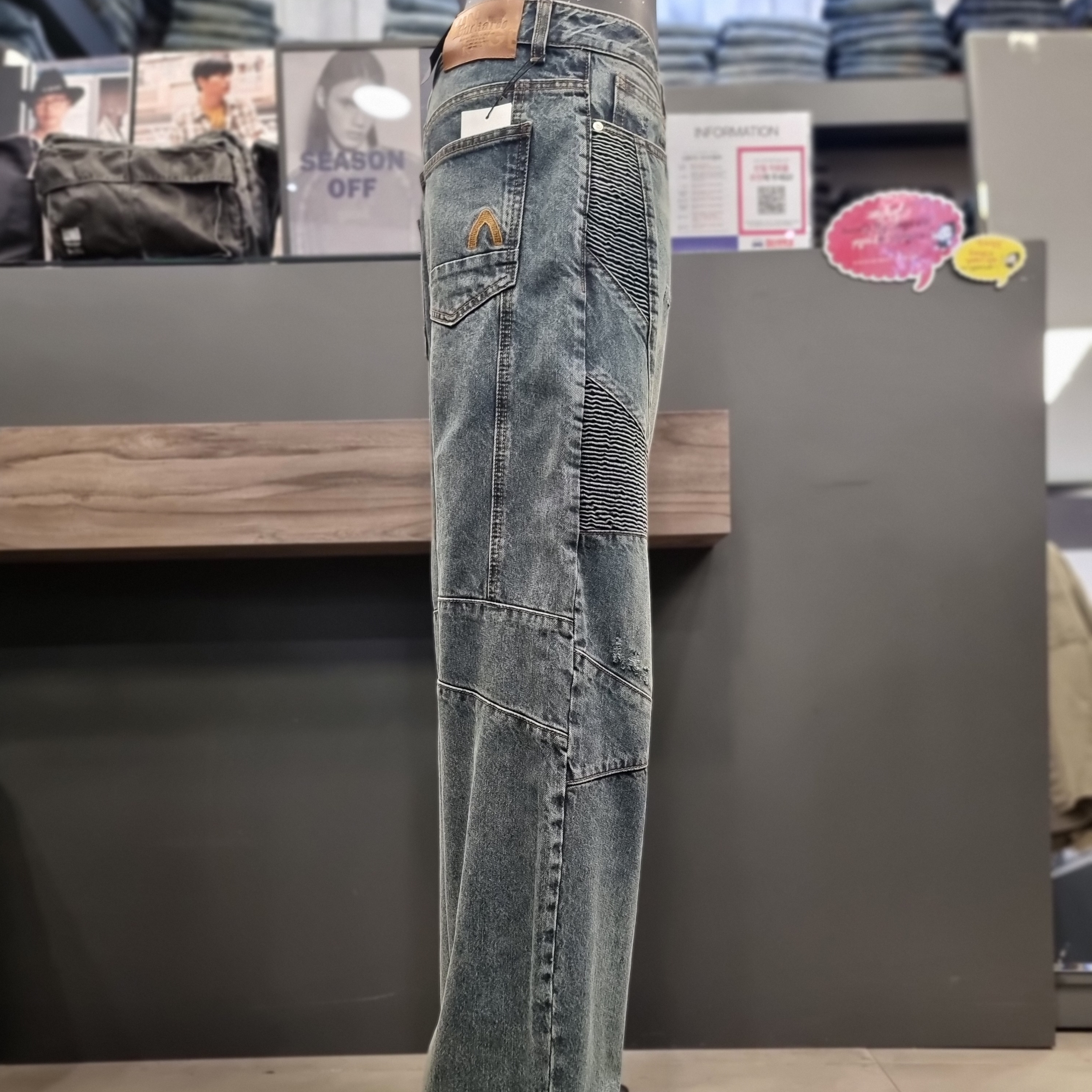 입체자수 디테일과 절재된 절개라인이 포인트인 바이커 디테일 데님 팬츠입니다.