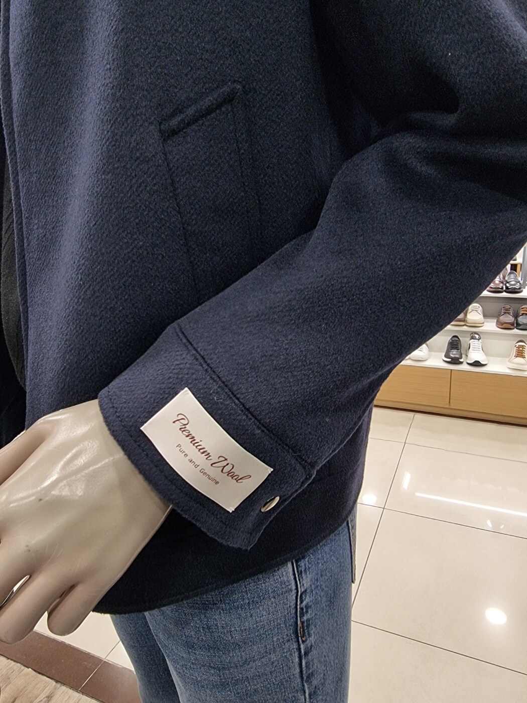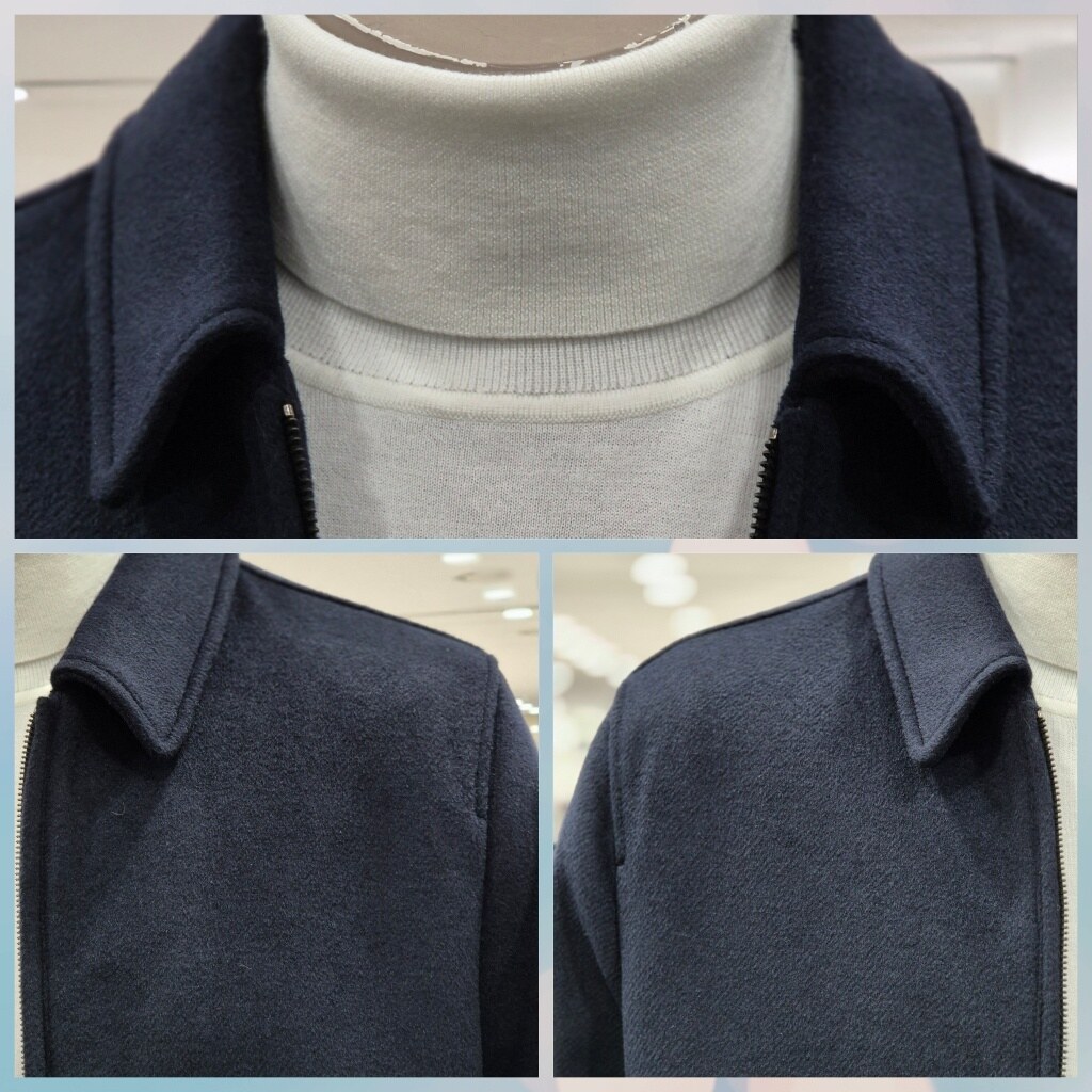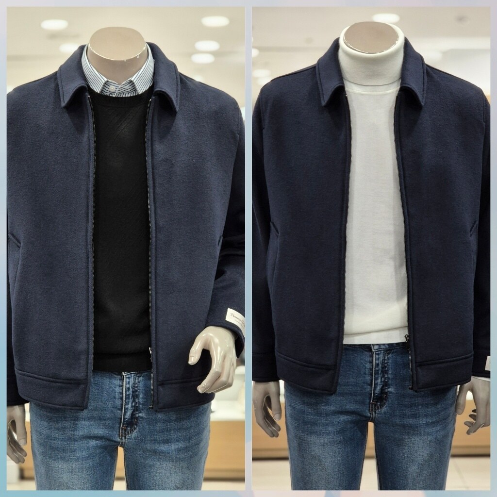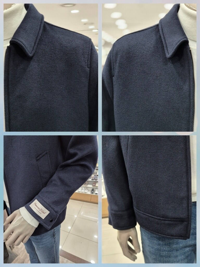 투톤 네이비 컬러가 고급스러운 울 혼방의 블루종입니다 단정한 핏과 탄탄한 메이킹이 포인트 기장 66센치의 톡톡한 두께감에 디자인드로 자켓 대용으로 포멀하게 자켓, 코트대용으로 세미하게 연출하기 좋은 아이템입니다 도토한 니트나 터틀넥에 청바지나 와이드 슬랙스로 트랜디하게 연출 가능합니다