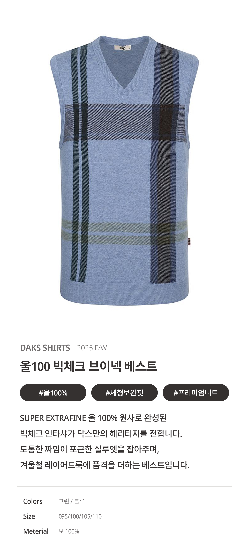 (롯데백화점)울100 빅체크 브이넥 베스트 양말2족증정+선물포장LW103B1