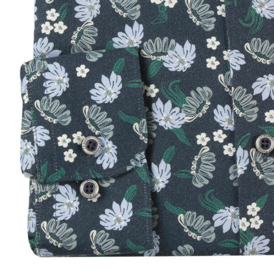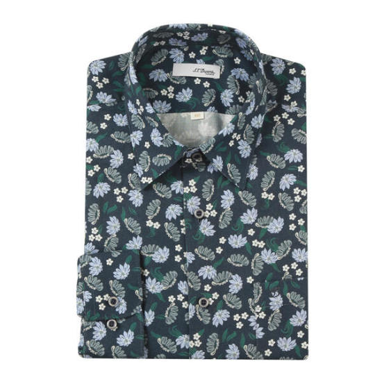 약 피치한 간절기 소재로 터치가 소프트하고 구김이 적은 면/레이온 혼방 플라워 모티브 프린트의 밑단 완만한 사양의 캐주얼한 비즈니스 남방 제품입니다.캐주얼 비즈니스 핏으로 등주름이 없는 사양입니다. 반달아시와 앞아시 높이를 2.3C로 하여 목부분을 편안하고 캐주얼 하게 입을 수 있도록 디자인 한 캐주얼 한 남방핏입니다.