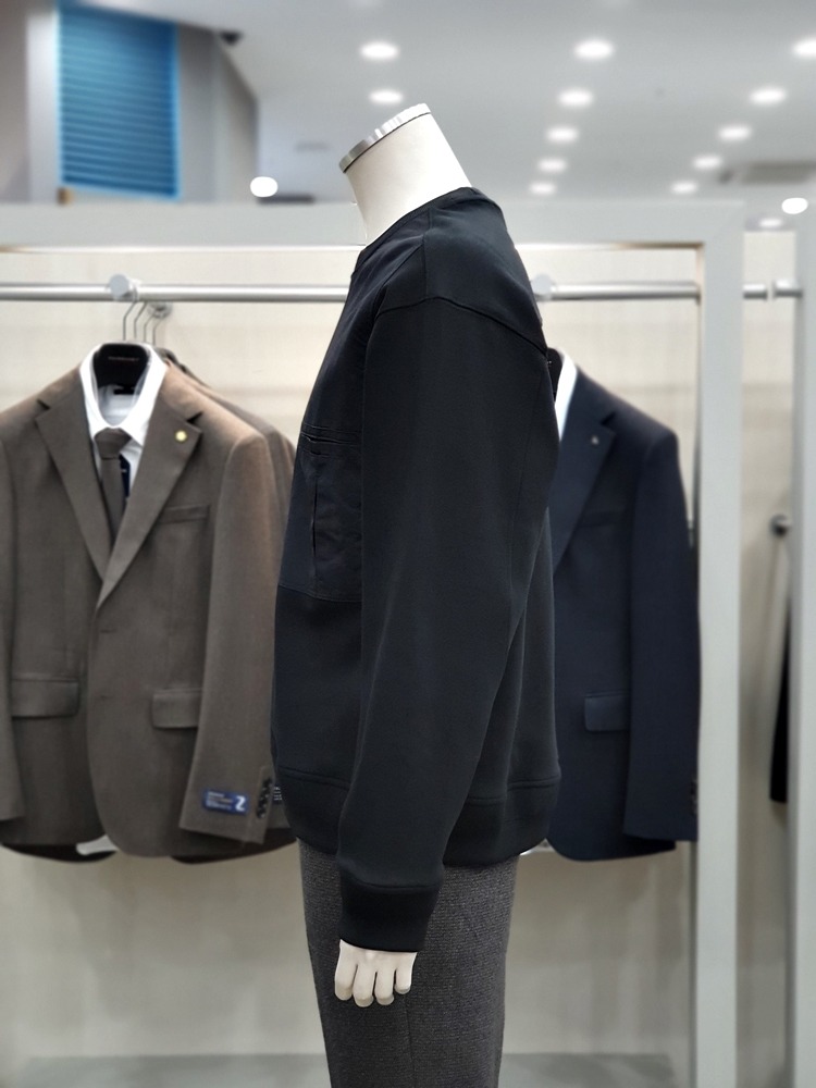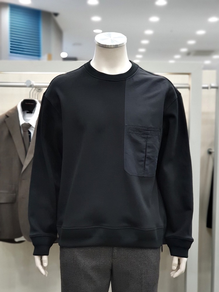 앞면 우븐 패치 배색과 포켓이 돋보이는 맨투맨 티셔츠입니다