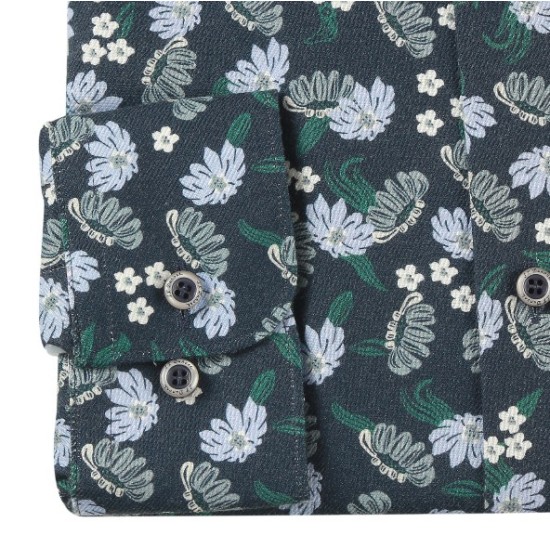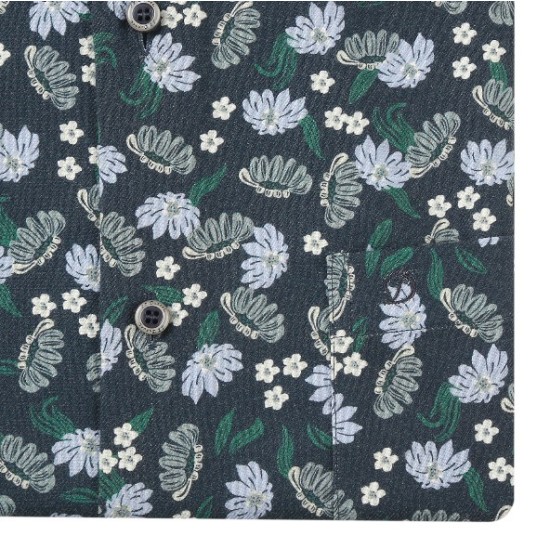 약 피치한 간절기 소재로 터치가 소프트하고 구김이 적은 면/레이온 혼방 플라워 모티브 프린트의 밑단 완만한 사양의 캐주얼한  비즈니스 남방 제품입니다