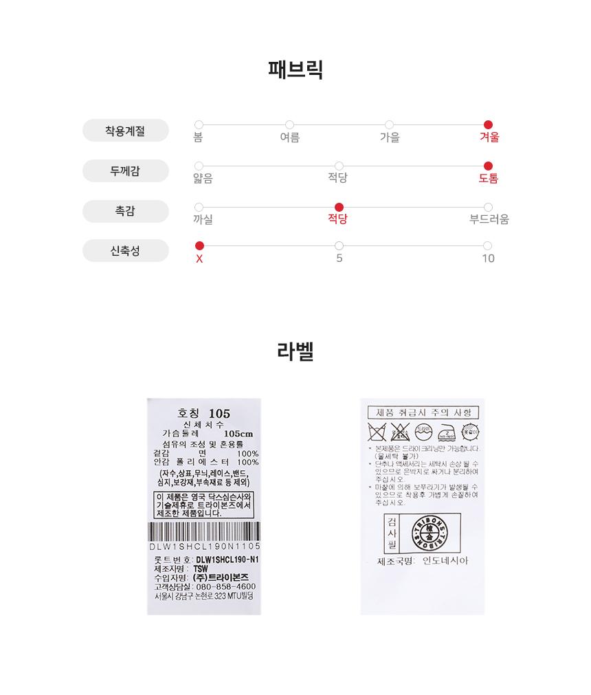 겉감은 천연 소재인 면100의 코듀로이 소재로 촉감이 부드러우며, 내구성이 우수하고,