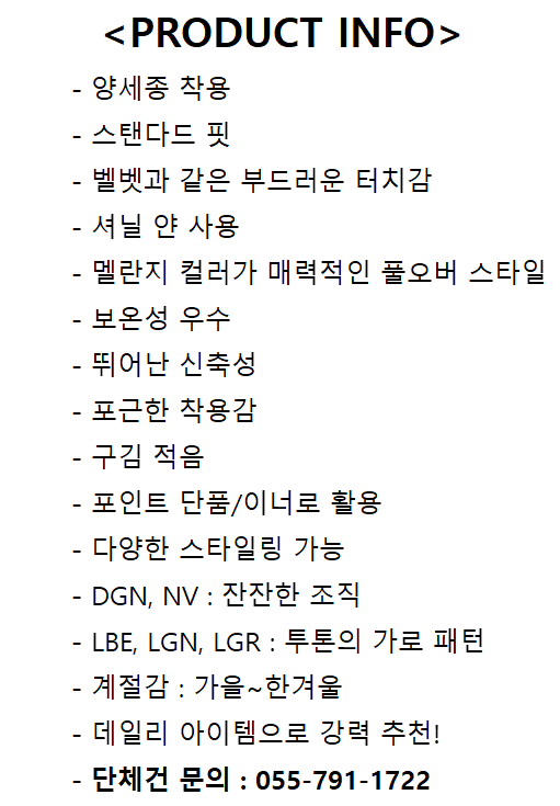| 색상 | DGN(다크그린),LBE(라이트베이지),LGN(라이트그린),LGR(라이트그레이),NV(네이비) |