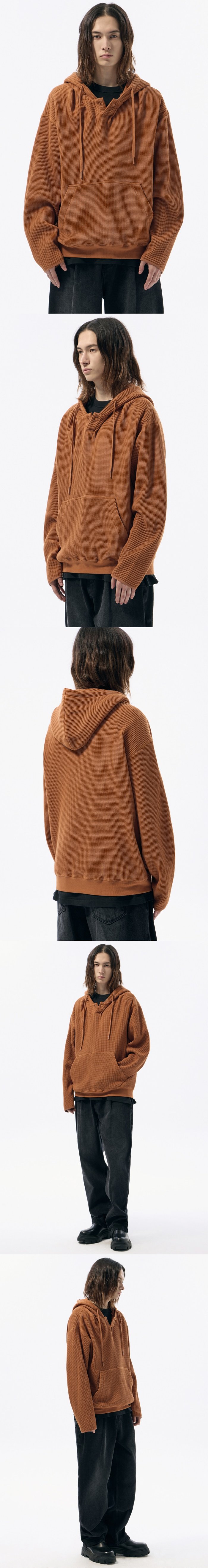 - 고중량의 와플패턴 원단을 사용한 후드 티셔츠.