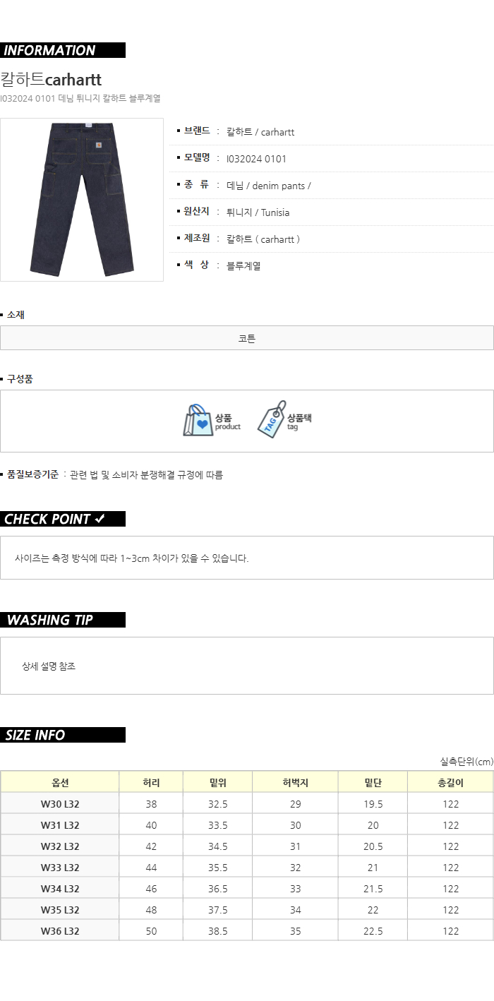 칼하트 I032024 0101 싱글니 데님 팬츠