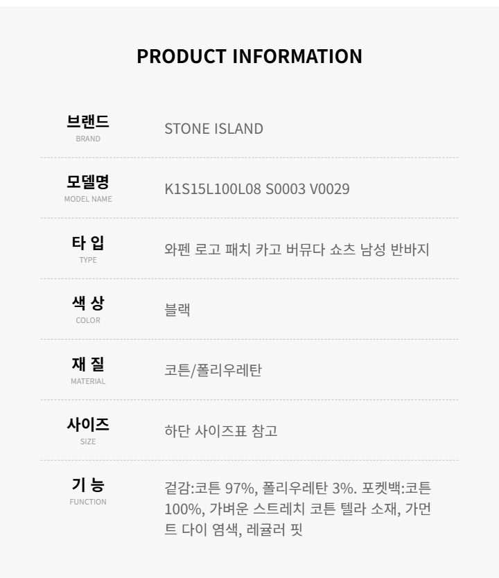 스톤아일랜드 바지 K1S15L100L08 S0003 V0029 와펜 로고 패치 카고 버뮤다 남성반바지 당일발송