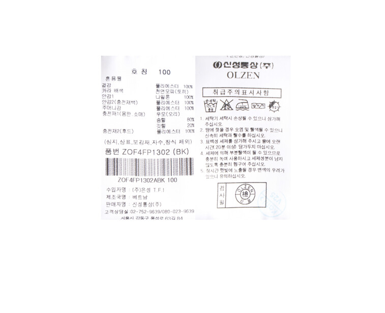 | 제품소재 | 겉감: 폴리에스터100% 배색?폴리에스터100% 카라배색:천연모피(토끼) 안감1 나일론 100% 안감2(충전재백) 폴리에스터100% 몸판,소매: 우모(오리) 솜털 80% 깃털20% 주머니감 폴리에스터 100% 충전재(후드): 폴리에스터 100% |