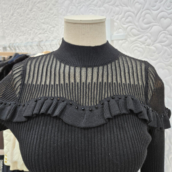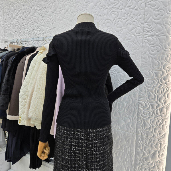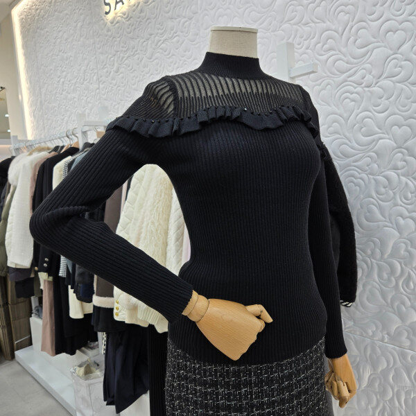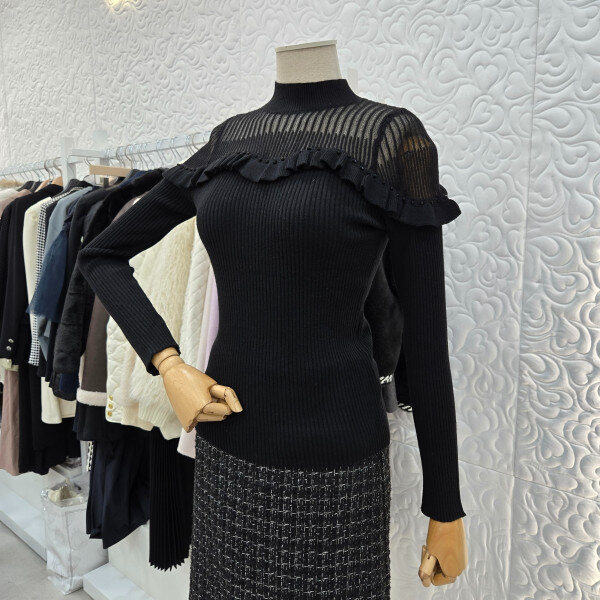 어깨 프릴 시스루 골지 니트티셔츠입니다.신축성 좋아 착용감이 편해요.실측사이즈 : 총기장 57 가슴단면 40