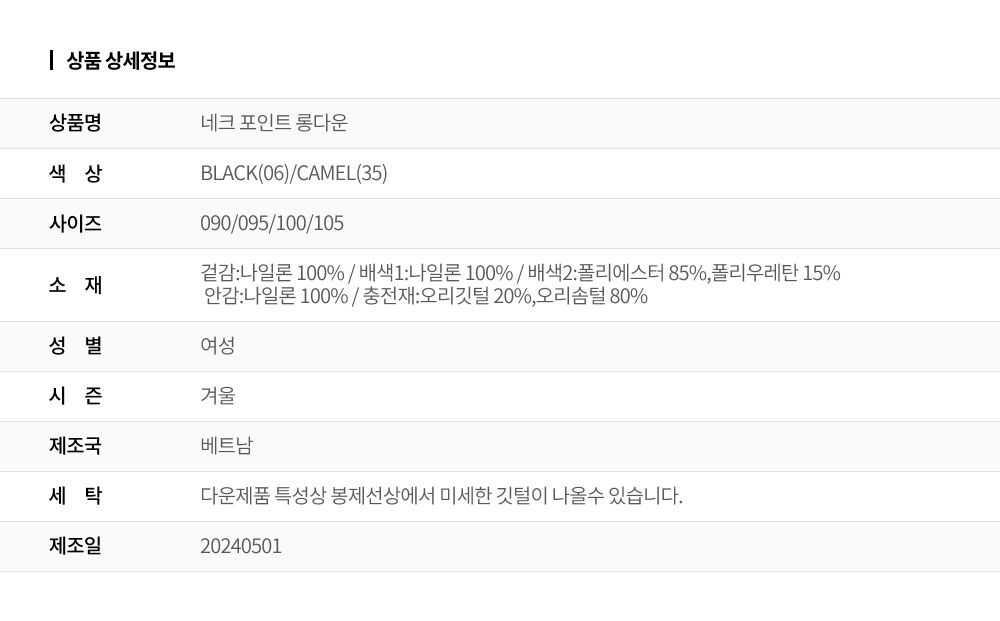 다운제품 특성상 봉제선상에서 미세한 깃털이 나올수 있습니다.