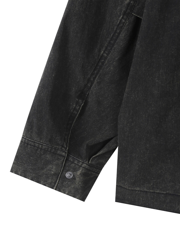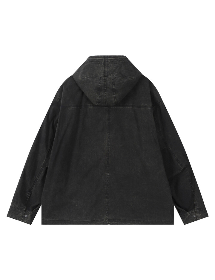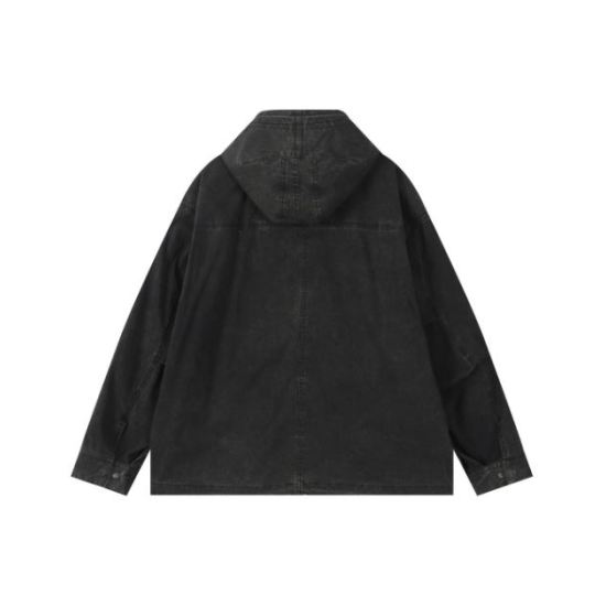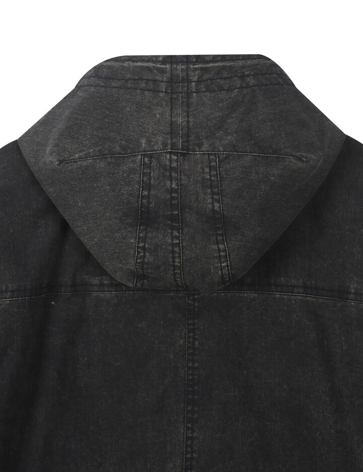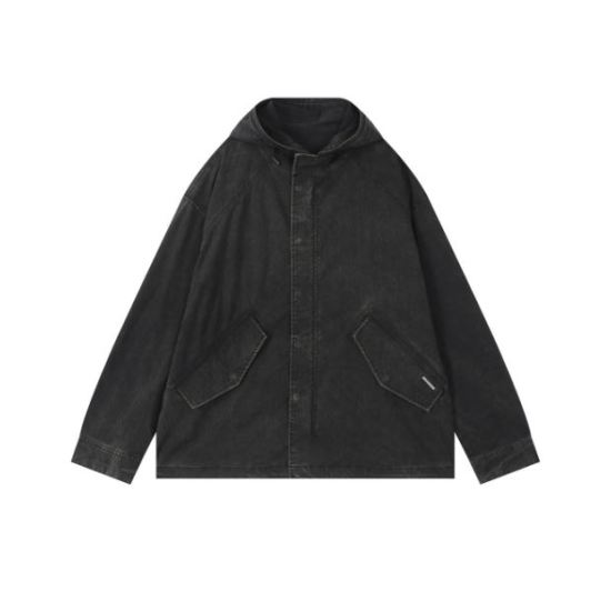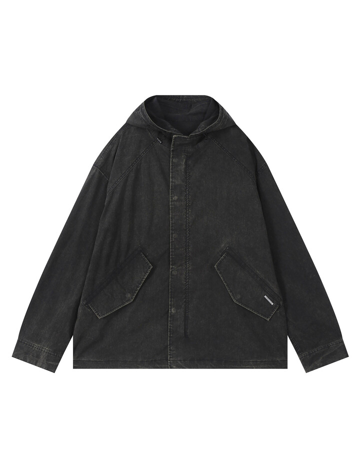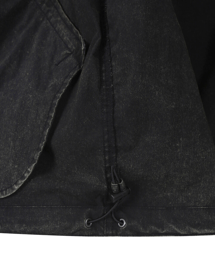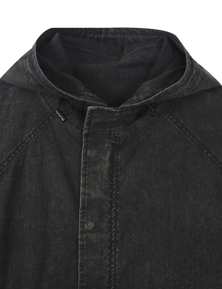 *드롭 숄더의 세미 루즈핏의 편안한 하이넥 후드 스타일로 캐주얼하며 C/N 소재에 에시드 워싱 기법으로 빈티지함을 살린 후드 야상 숏 점퍼