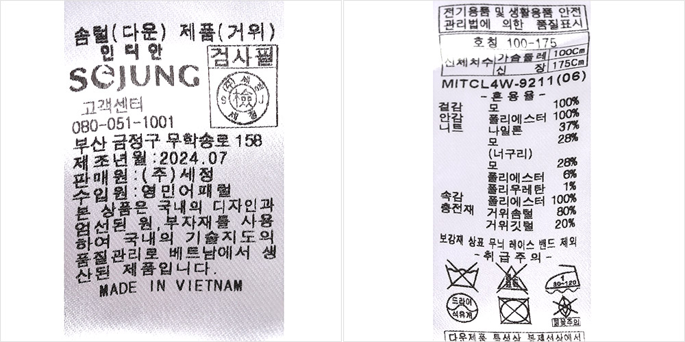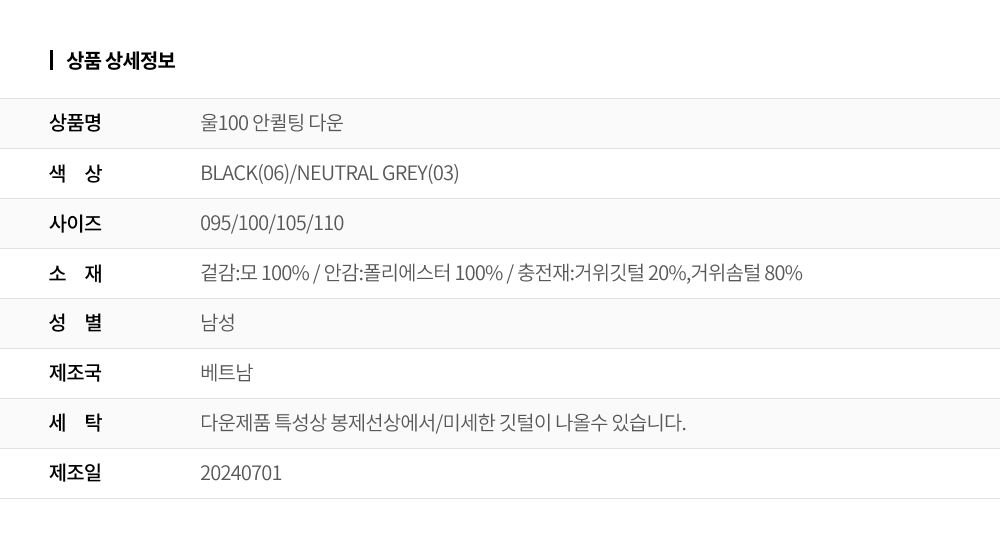 다운제품 특성상 봉제선상에서/미세한 깃털이 나올수 있습니다.