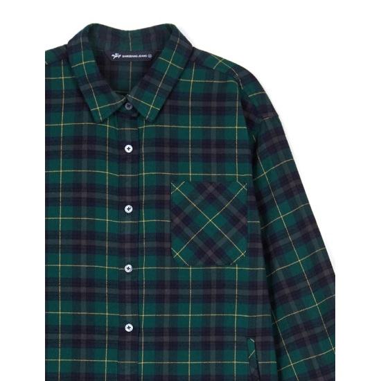 2025년 가을 신상품이며 오버핏 스타일의 체크 셔켓 긴팔 남방이여 앞 가슴 부분에 포켓으로 포인트를 주었으며 때로는 오픈해서 셔켓 남방