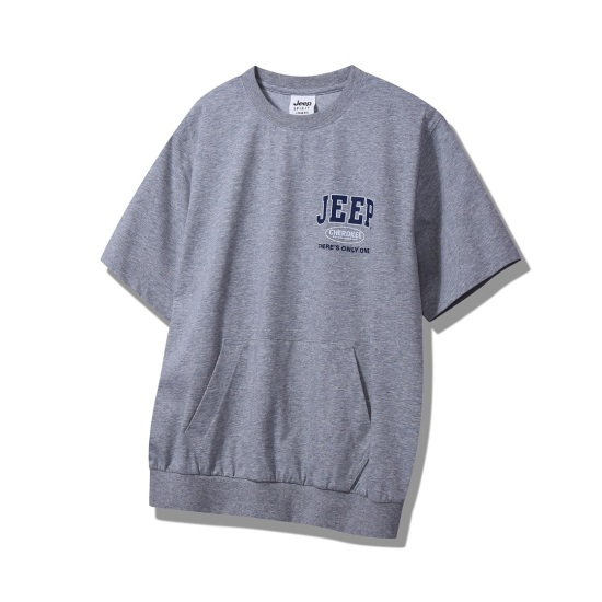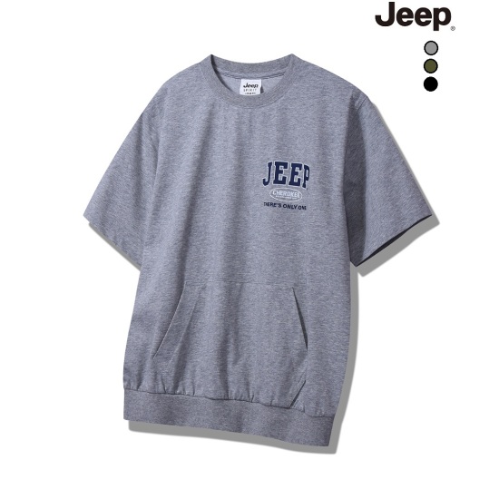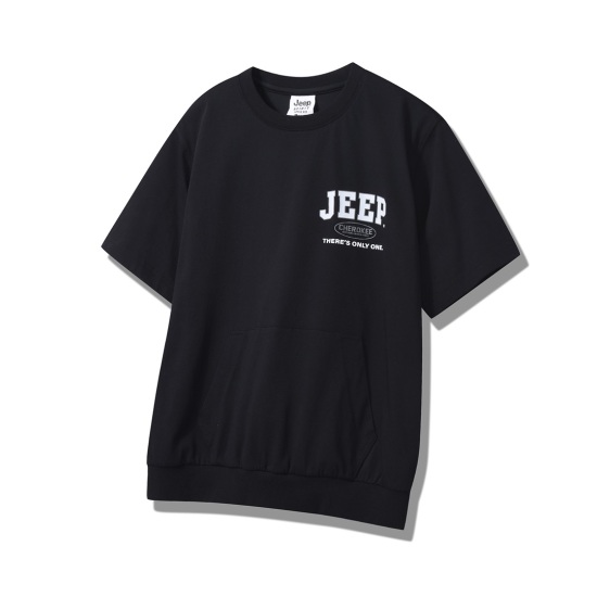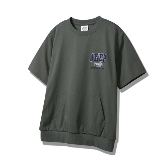 반팔에 캥거루 포켓 디테일이 있고, 가슴에 지프 로고와 CHEROKEE 레터링 프린트, 옆선에 체로키 차 라벨이터치감이 부드러운 것이 특징입니다.