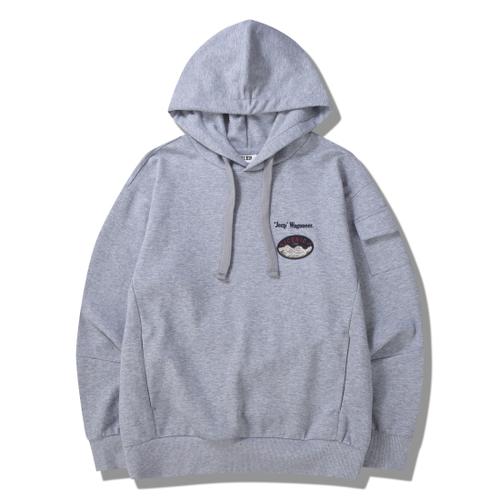 상동에 지프만의 마운틴 그래픽을 사용한 레터링 자수와 와펜으로 포인트를 주었습니다.
