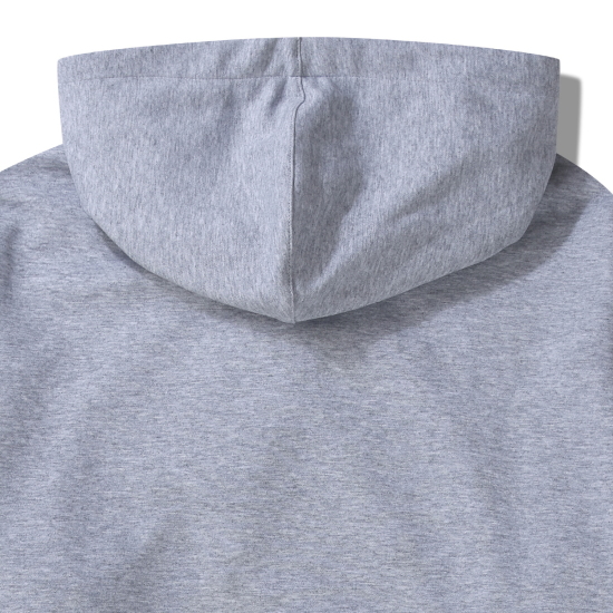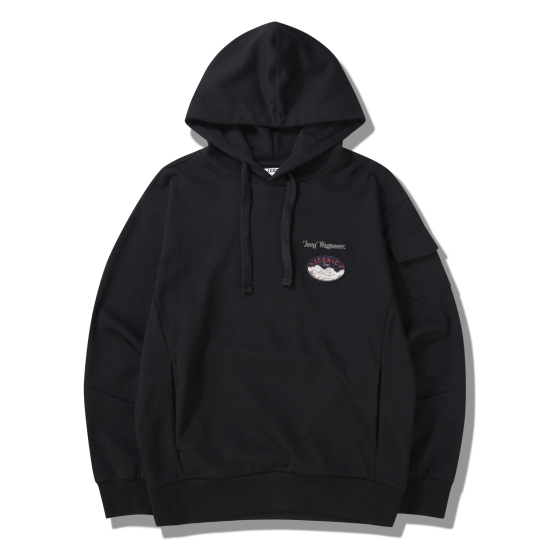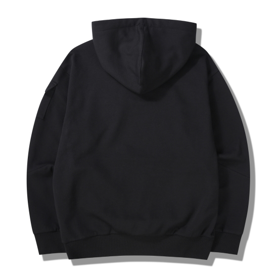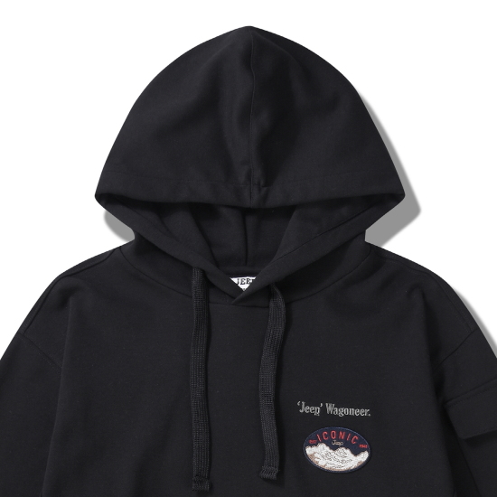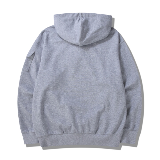 후드 스트링이 있어 사이즈 조절이 가능하고, 몸판의 트임포켓과 소매의 아웃패치 포켓으로 디테일을