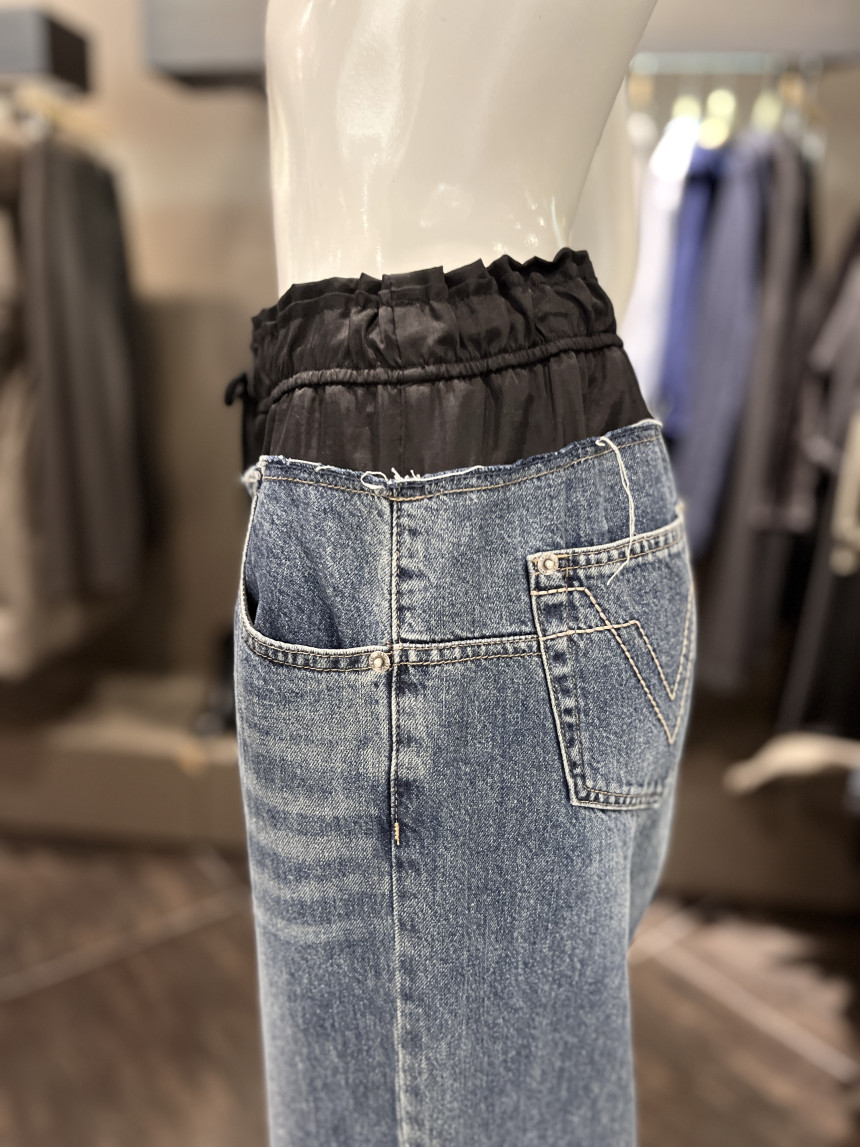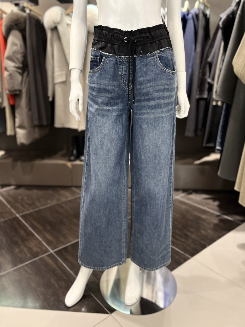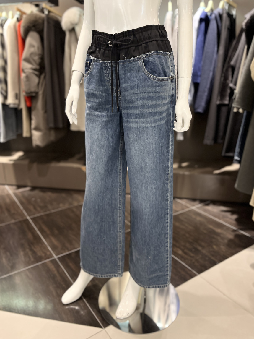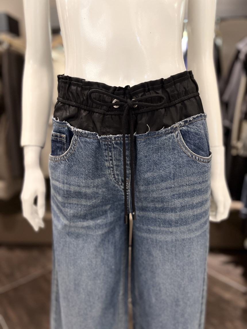 윗면 나일론 소재의 텍스처를 블록하여 스타일리시한 디테일을 더하는 데님 팬츠입니다.